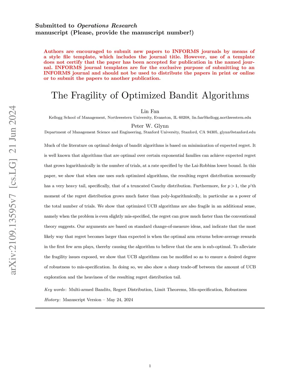 Much of the literature on optimal design of bandit algorithms is based on minimization of expected regret. It is well known that designs that are optimal over certain exponential families can achieve expected regret that grows logarithmically in the number of arm plays, at a rate governed by the Lai-Robbins lower bound. In this paper, we show that when one uses such optimized designs, the regret distribution of the associated algorithms necessarily has a very heavy tail, specifically, that of a truncated Cauchy distribution. Furthermore, for , the 'th moment of the regret distribution grows much faster than poly-logarithmically, in particular as a power of the total number of arm plays. We show that optimized UCB bandit designs are also fragile in an additional sense, namely when the problem is even slightly mis-specified, the regret can grow much faster than the conventional theory suggests. Our arguments are based on standard change-of-measure ideas, and indicate that the most likely way that regret becomes larger than expected is when the optimal arm returns below-average rewards in the first few arm plays, thereby causing the algorithm to believe that the arm is sub-optimal. To alleviate the fragility issues exposed, we show that UCB algorithms can be modified so as to ensure a desired degree of robustness to mis-specification. In doing so, we also show a sharp trade-off between the amount of UCB exploration and the heaviness of the resulting regret distribution tail.