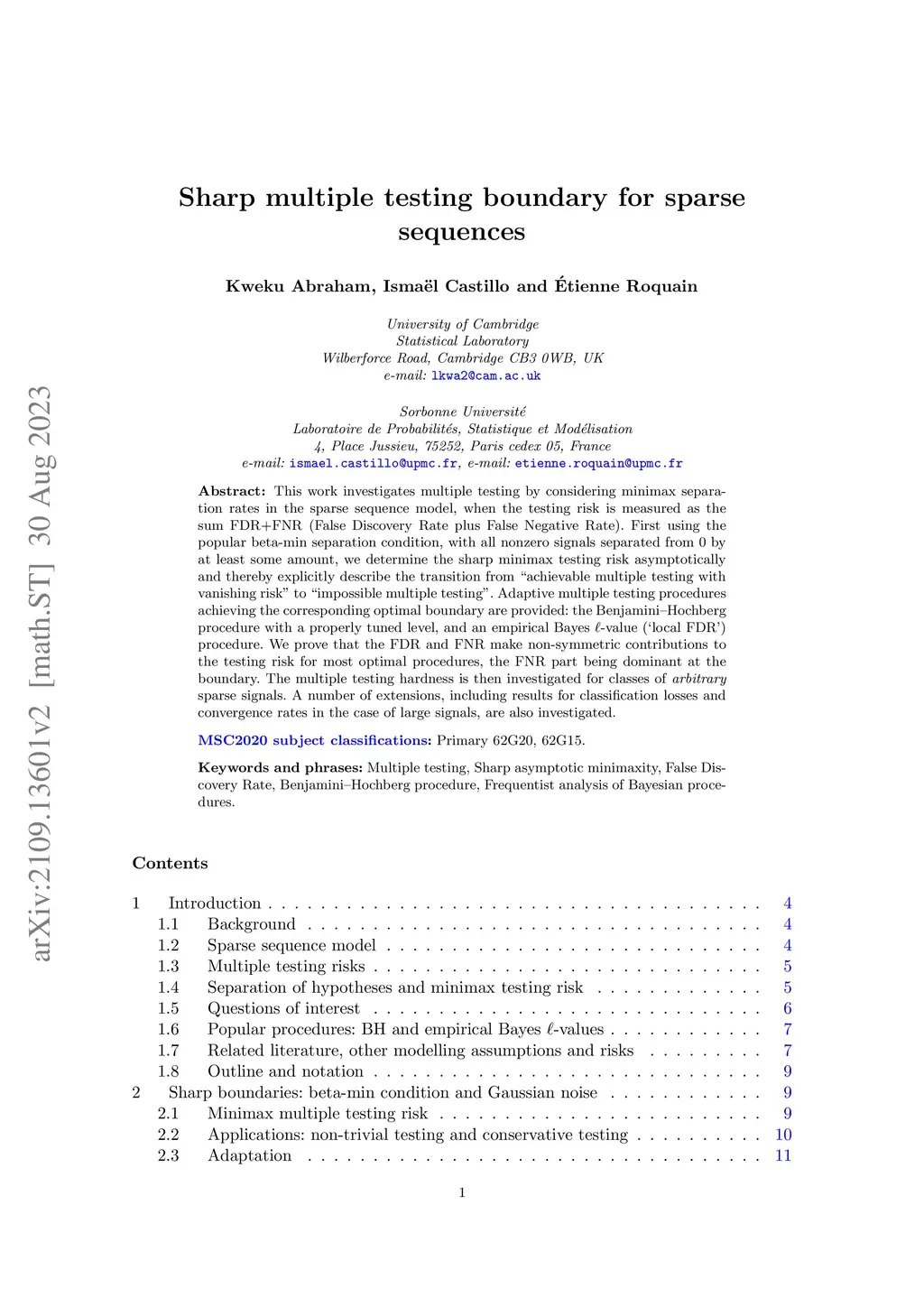 This work investigates multiple testing by considering minimax separation rates in the sparse sequence model, when the testing risk is measured as the sum FDR+FNR (False Discovery Rate plus False Negative Rate). First using the popular beta-min separation condition, with all nonzero signals separated from by at least some amount, we determine the sharp minimax testing risk asymptotically and thereby explicitly describe the transition from "achievable multiple testing with vanishing risk" to "impossible multiple testing". Adaptive multiple testing procedures achieving the corresponding optimal boundary are provided: the Benjamini--Hochberg procedure with a properly tuned level, and an empirical Bayes -value (`local FDR') procedure. We prove that the FDR and FNR make non-symmetric contributions to the testing risk for most optimal procedures, the FNR part being dominant at the boundary. The multiple testing hardness is then investigated for classes of arbitrary sparse signals. A number of extensions, including results for classification losses and convergence rates in the case of large signals, are also investigated.