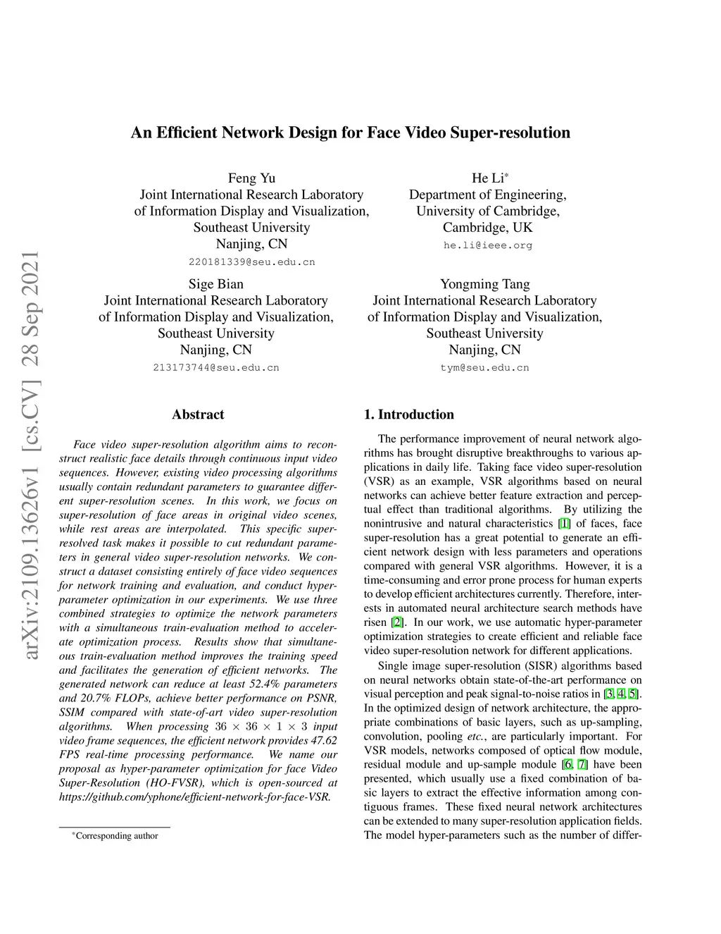 Face video super-resolution algorithm aims to reconstruct realistic face details through continuous input video sequences. However, existing video processing algorithms usually contain redundant parameters to guarantee different super-resolution scenes. In this work, we focus on super-resolution of face areas in original video scenes, while rest areas are interpolated. This specific super-resolved task makes it possible to cut redundant parameters in general video super-resolution networks. We construct a dataset consisting entirely of face video sequences for network training and evaluation, and conduct hyper-parameter optimization in our experiments. We use three combined strategies to optimize the network parameters with a simultaneous train-evaluation method to accelerate optimization process. Results show that simultaneous train-evaluation method improves the training speed and facilitates the generation of efficient networks. The generated network can reduce at least 52.4% parameters and 20.7% FLOPs, achieve better performance on PSNR, SSIM compared with state-of-art video super-resolution algorithms. When processing 36x36x1x3 input video frame sequences, the efficient network provides 47.62 FPS real-time processing performance. We name our proposal as hyper-parameter optimization for face Video Super-Resolution (HO-FVSR), which is open-sourced at https://github.com/yphone/efficient-network-for-face-VSR.