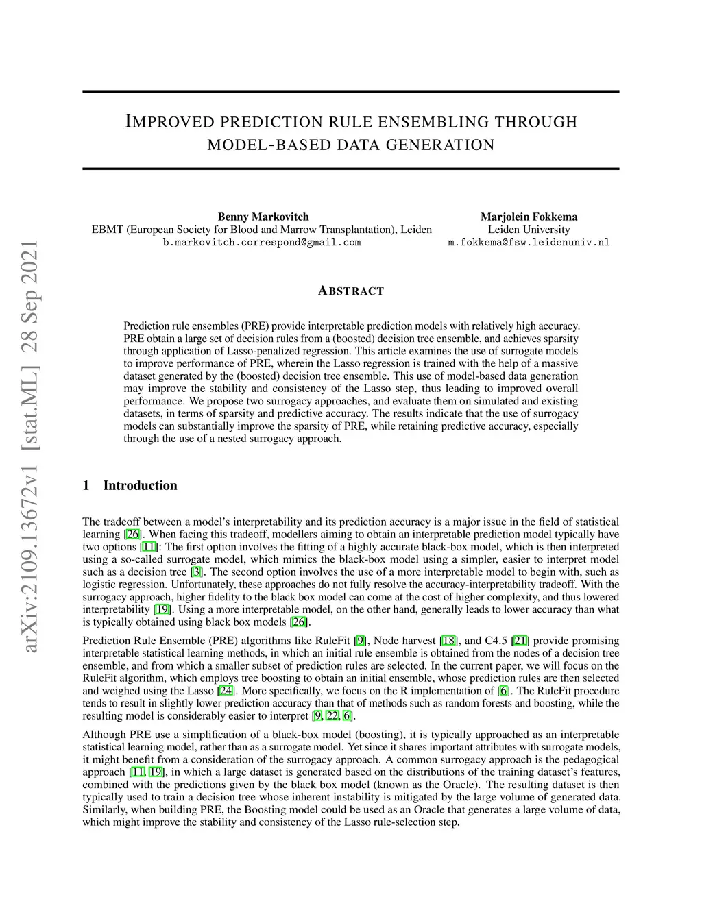 Prediction rule ensembles (PRE) provide interpretable prediction models with relatively high accuracy.PRE obtain a large set of decision rules from a (boosted) decision tree ensemble, and achieves sparsitythrough application of Lasso-penalized regression. This article examines the use of surrogate modelsto improve performance of PRE, wherein the Lasso regression is trained with the help of a massivedataset generated by the (boosted) decision tree ensemble. This use of model-based data generationmay improve the stability and consistency of the Lasso step, thus leading to improved overallperformance. We propose two surrogacy approaches, and evaluate them on simulated and existingdatasets, in terms of sparsity and predictive accuracy. The results indicate that the use of surrogacymodels can substantially improve the sparsity of PRE, while retaining predictive accuracy, especiallythrough the use of a nested surrogacy approach.