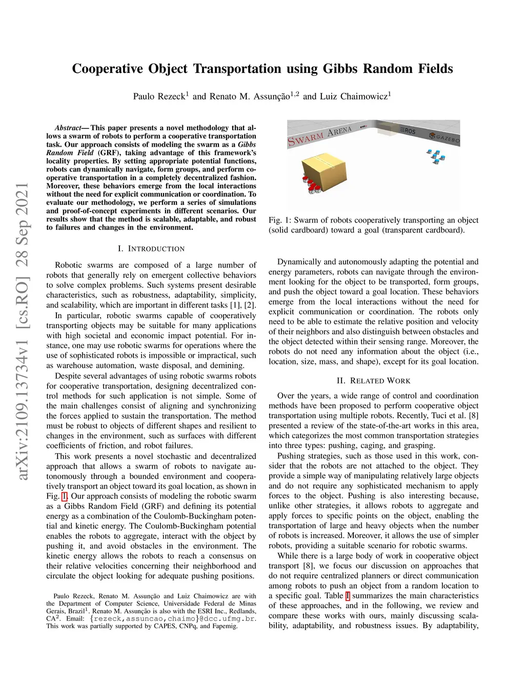 This paper presents a novel methodology that allows a swarm of robots to perform a cooperative transportation task. Our approach consists of modeling the swarm as a {\em Gibbs Random Field} (GRF), taking advantage of this framework's locality properties. By setting appropriate potential functions, robots can dynamically navigate, form groups, and perform cooperative transportation in a completely decentralized fashion. Moreover, these behaviors emerge from the local interactions without the need for explicit communication or coordination. To evaluate our methodology, we perform a series of simulations and proof-of-concept experiments in different scenarios. Our results show that the method is scalable, adaptable, and robust to failures and changes in the environment.