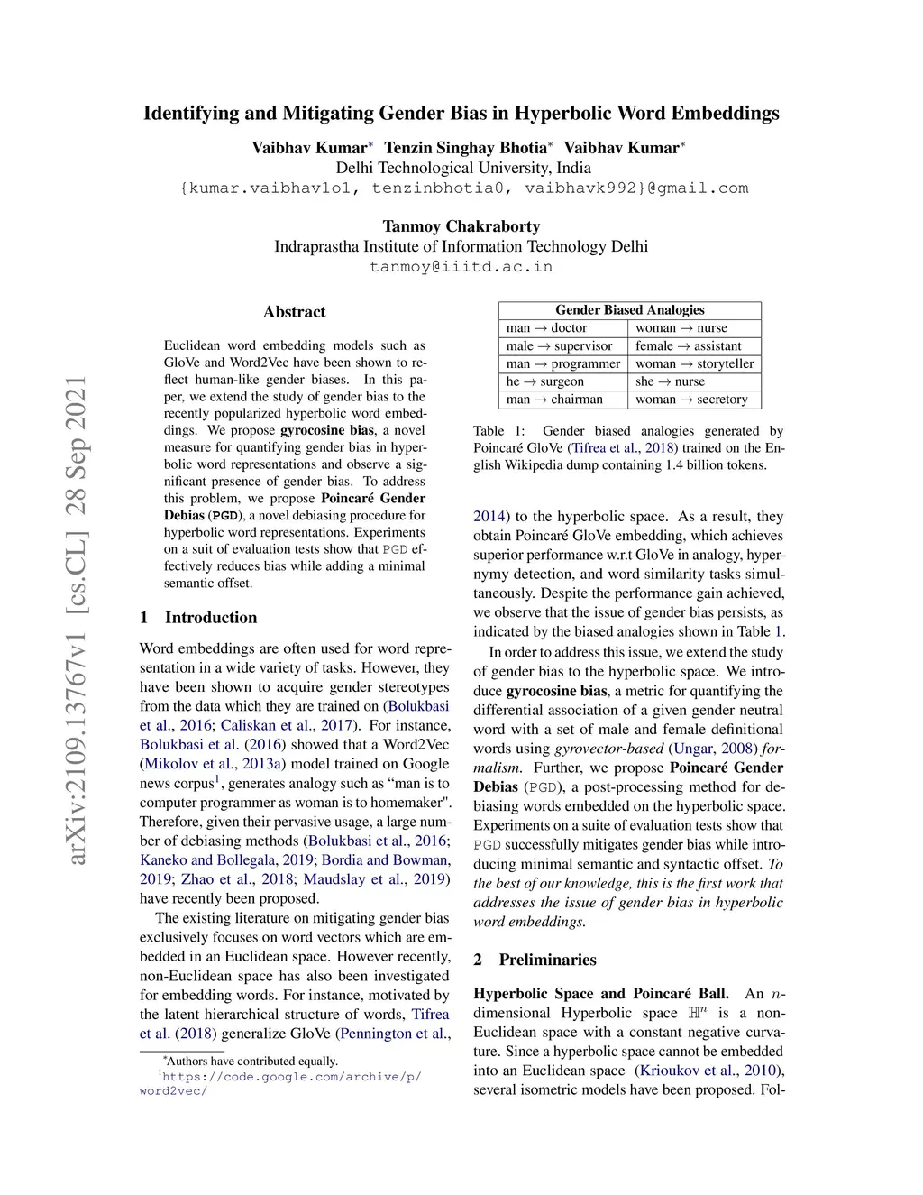 Identifying and Mitigating Gender Bias in Hyperbolic Word Embeddings