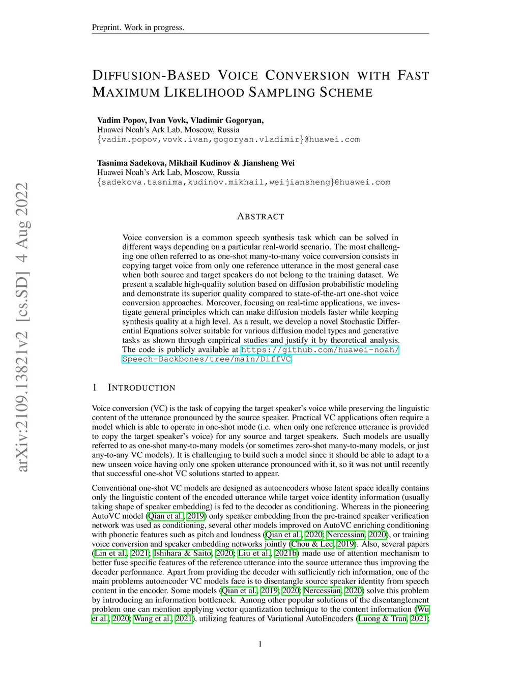 Diffusion-Based Voice Conversion with Fast Maximum Likelihood Sampling