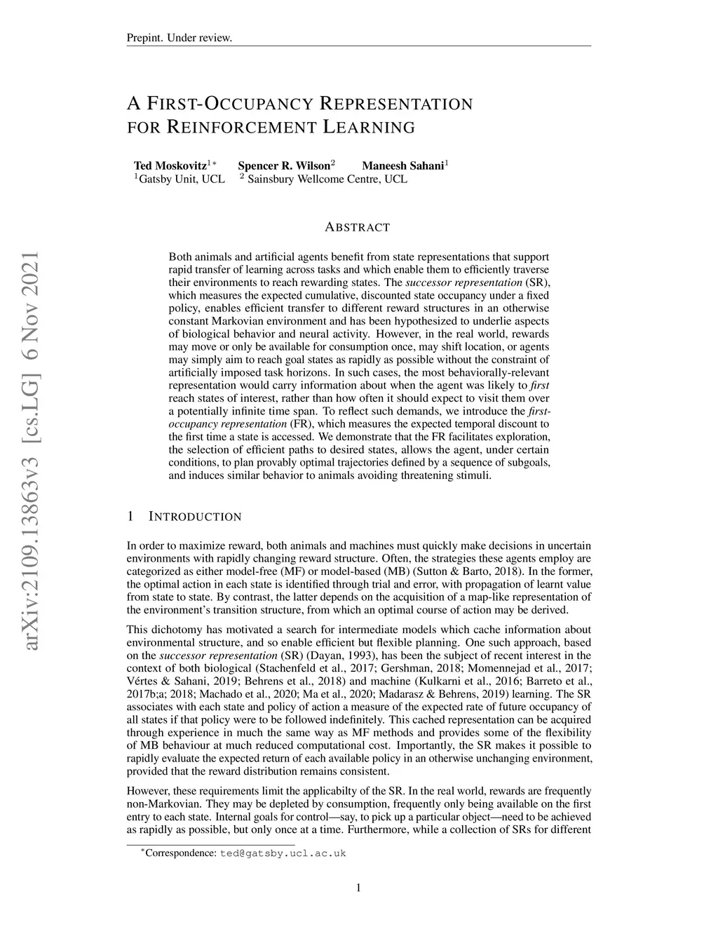 Both animals and artificial agents benefit from state representations that support rapid transfer of learning across tasks and which enable them to efficiently traverse their environments to reach rewarding states. The successor representation (SR), which measures the expected cumulative, discounted state occupancy under a fixed policy, enables efficient transfer to different reward structures in an otherwise constant Markovian environment and has been hypothesized to underlie aspects of biological behavior and neural activity. However, in the real world, rewards may move or only be available for consumption once, may shift location, or agents may simply aim to reach goal states as rapidly as possible without the constraint of artificially imposed task horizons. In such cases, the most behaviorally-relevant representation would carry information about when the agent was likely to first reach states of interest, rather than how often it should expect to visit them over a potentially infinite time span. To reflect such demands, we introduce the first-occupancy representation (FR), which measures the expected temporal discount to the first time a state is accessed. We demonstrate that the FR facilitates exploration, the selection of efficient paths to desired states, allows the agent, under certain conditions, to plan provably optimal trajectories defined by a sequence of subgoals, and induces similar behavior to animals avoiding threatening stimuli.