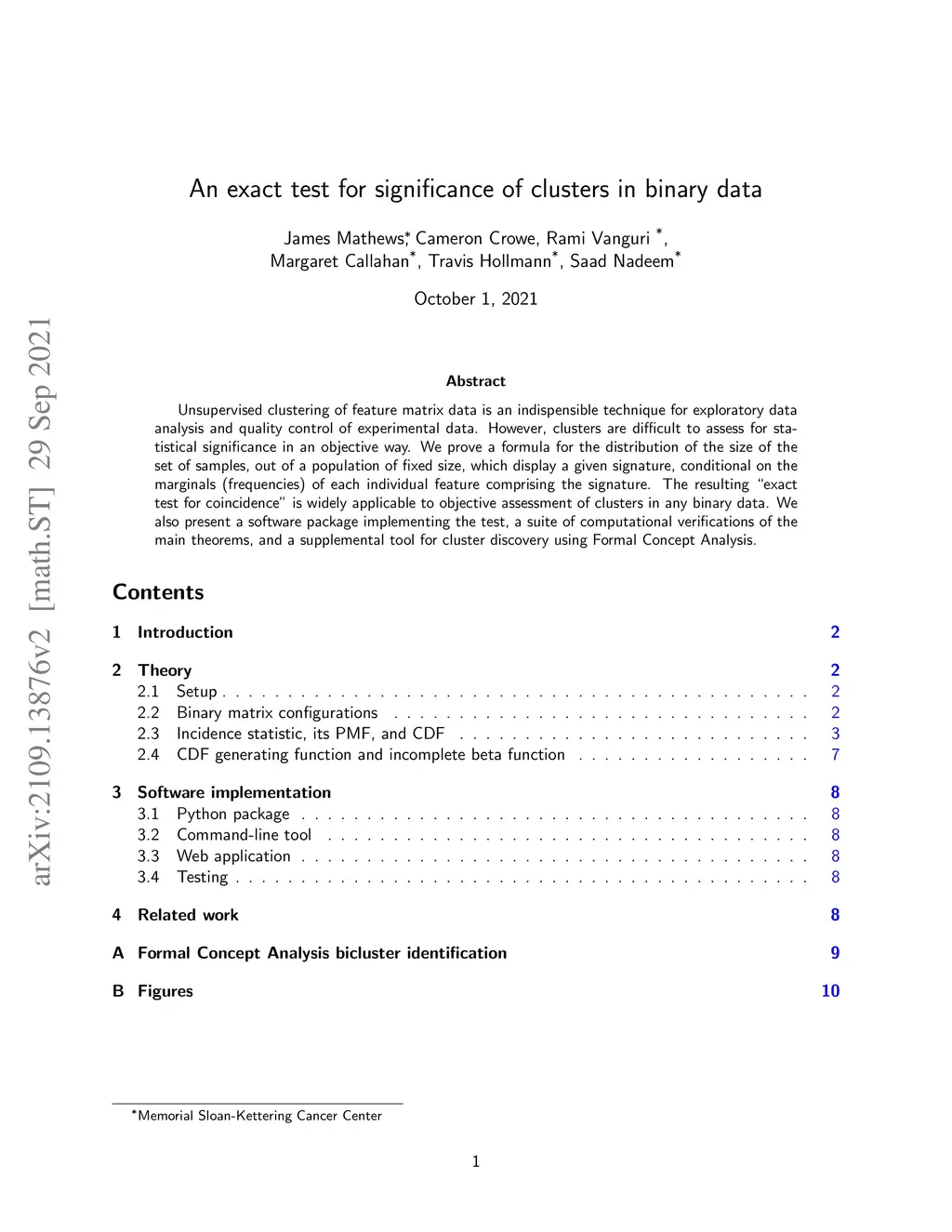 Unsupervised clustering of feature matrix data is an indispensible technique for exploratory data analysis and quality control of experimental data. However, clusters are difficult to assess for statistical significance in an objective way. We prove a formula for the distribution of the size of the set of samples, out of a population of fixed size, which display a given signature, conditional on the marginals (frequencies) of each individual feature comprising the signature. The resulting "exact test for coincidence" is widely applicable to objective assessment of clusters in any binary data. We also present a software package implementing the test, a suite of computational verifications of the main theorems, and a supplemental tool for cluster discovery using Formal Concept Analysis.