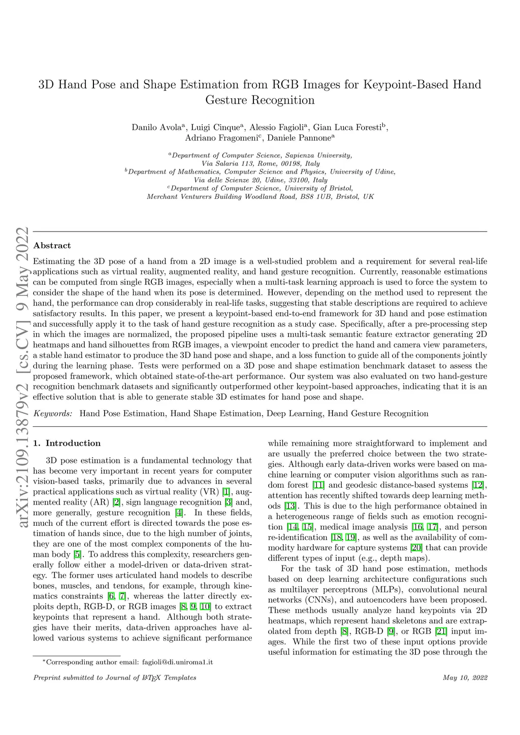Estimating the 3D pose of a hand from a 2D image is a well-studied problem and a requirement for several real-life applications such as virtual reality, augmented reality, and hand gesture recognition. Currently, reasonable estimations can be computed from single RGB images, especially when a multi-task learning approach is used to force the system to consider the shape of the hand when its pose is determined. However, depending on the method used to represent the hand, the performance can drop considerably in real-life tasks, suggesting that stable descriptions are required to achieve satisfactory results. In this paper, we present a keypoint-based end-to-end framework for 3D hand and pose estimation and successfully apply it to the task of hand gesture recognition as a study case. Specifically, after a pre-processing step in which the images are normalized, the proposed pipeline uses a multi-task semantic feature extractor generating 2D heatmaps and hand silhouettes from RGB images, a viewpoint encoder to predict the hand and camera view parameters, a stable hand estimator to produce the 3D hand pose and shape, and a loss function to guide all of the components jointly during the learning phase. Tests were performed on a 3D pose and shape estimation benchmark dataset to assess the proposed framework, which obtained state-of-the-art performance. Our system was also evaluated on two hand-gesture recognition benchmark datasets and significantly outperformed other keypoint-based approaches, indicating that it is an effective solution that is able to generate stable 3D estimates for hand pose and shape.