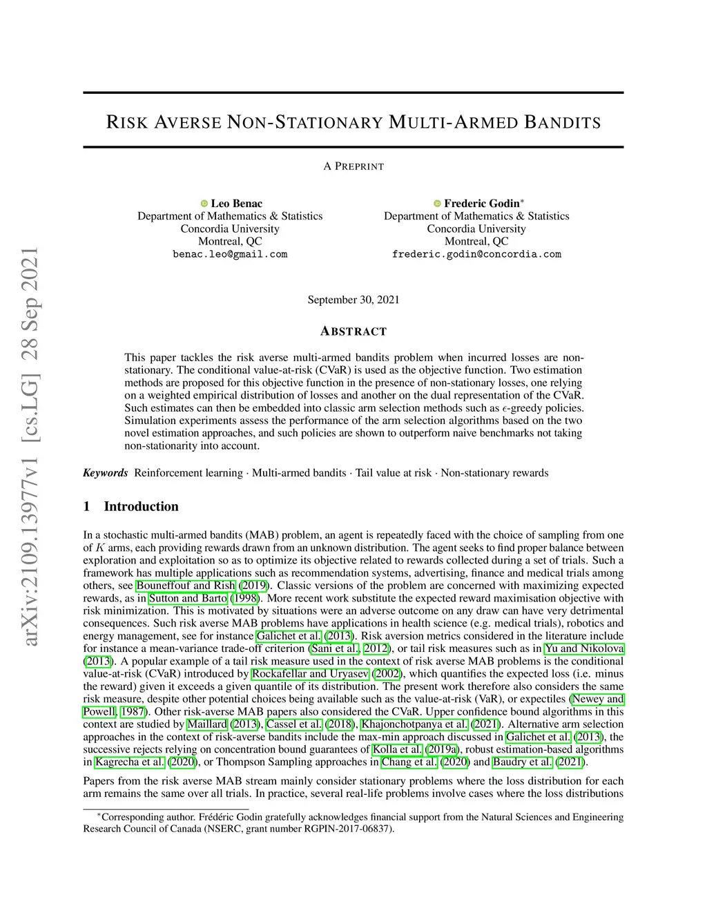 This paper tackles the risk averse multi-armed bandits problem when incurred losses are non-stationary. The conditional value-at-risk (CVaR) is used as the objective function. Two estimation methods are proposed for this objective function in the presence of non-stationary losses, one relying on a weighted empirical distribution of losses and another on the dual representation of the CVaR. Such estimates can then be embedded into classic arm selection methods such as epsilon-greedy policies. Simulation experiments assess the performance of the arm selection algorithms based on the two novel estimation approaches, and such policies are shown to outperform naive benchmarks not taking non-stationarity into account.