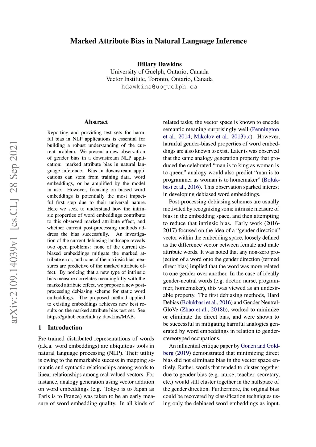 Reporting and providing test sets for harmful bias in NLP applications is essential for building a robust understanding of the current problem. We present a new observation of gender bias in a downstream NLP application: marked attribute bias in natural language inference. Bias in downstream applications can stem from training data, word embeddings, or be amplified by the model in use. However, focusing on biased word embeddings is potentially the most impactful first step due to their universal nature. Here we seek to understand how the intrinsic properties of word embeddings contribute to this observed marked attribute effect, and whether current post-processing methods address the bias successfully. An investigation of the current debiasing landscape reveals two open problems: none of the current debiased embeddings mitigate the marked attribute error, and none of the intrinsic bias measures are predictive of the marked attribute effect. By noticing that a new type of intrinsic bias measure correlates meaningfully with the marked attribute effect, we propose a new postprocessing debiasing scheme for static word embeddings. The proposed method applied to existing embeddings achieves new best results on the marked attribute bias test set. See https://github.com/hillary-dawkins/MAB.