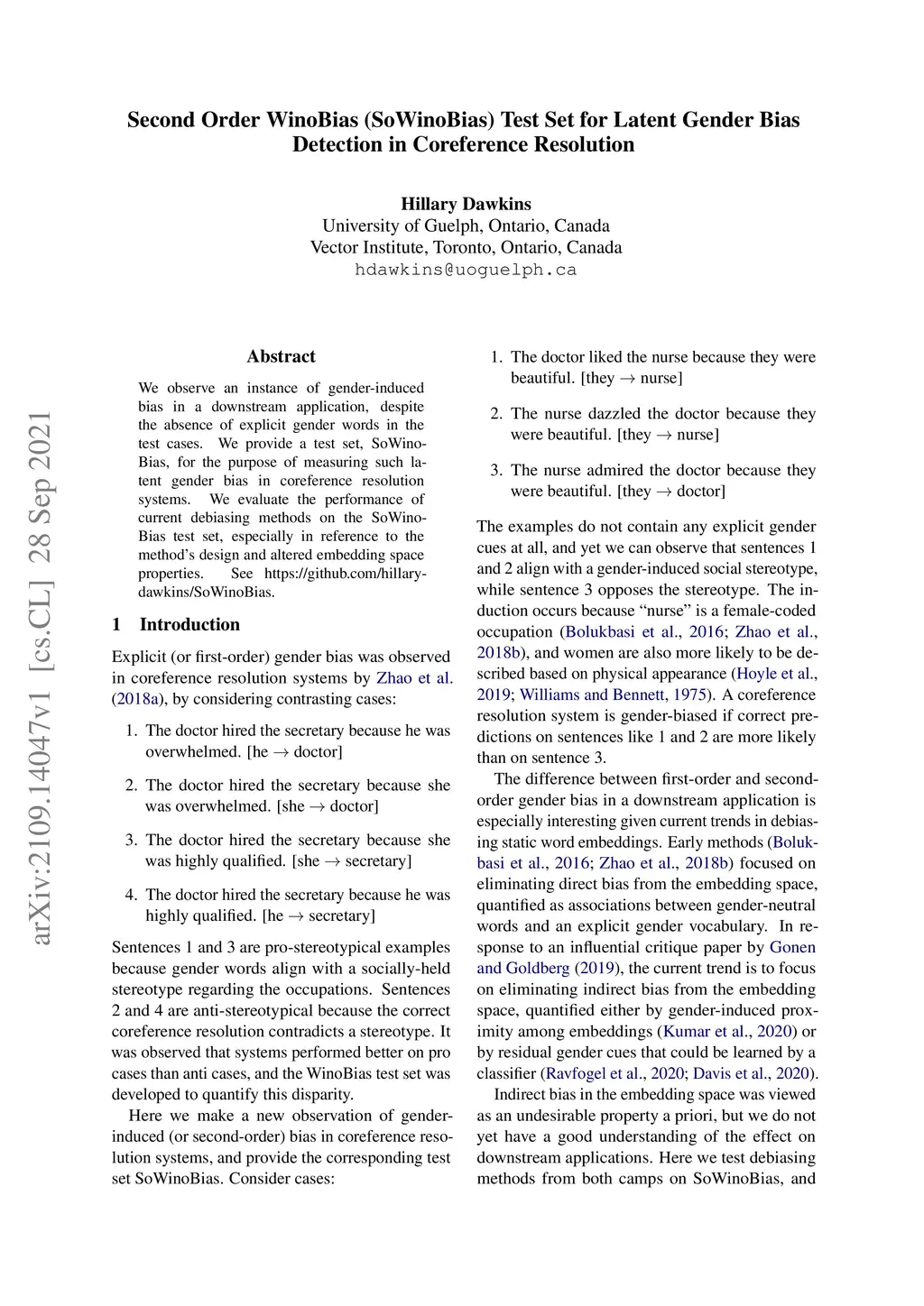 We observe an instance of gender-induced bias in a downstream application, despite the absence of explicit gender words in the test cases. We provide a test set, SoWinoBias, for the purpose of measuring such latent gender bias in coreference resolution systems. We evaluate the performance of current debiasing methods on the SoWinoBias test set, especially in reference to the method's design and altered embedding space properties. See https://github.com/hillarydawkins/SoWinoBias.