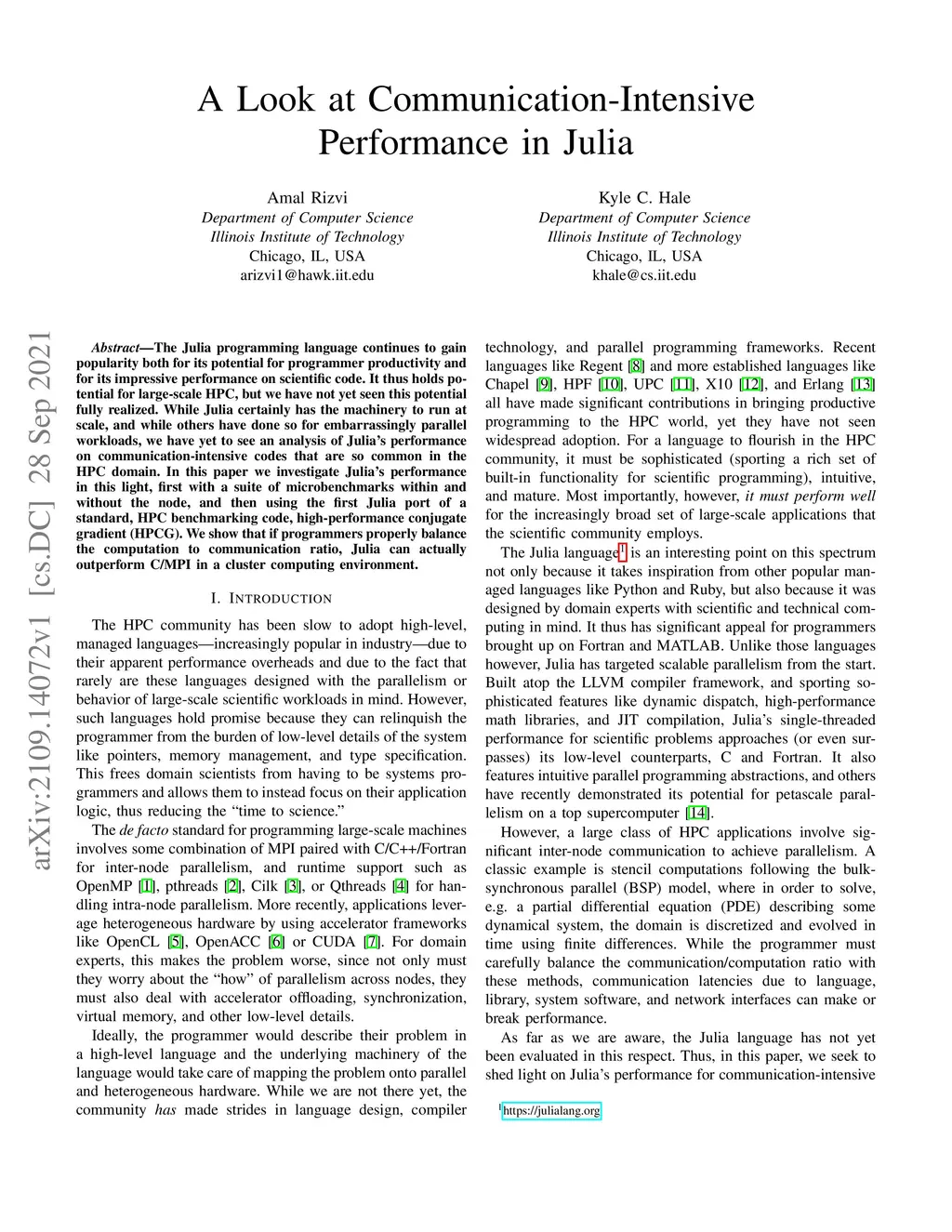 The Julia programming language continues to gain popularity both for its potential for programmer productivity and for its impressive performance on scientific code. It thus holds potential for large-scale HPC, but we have not yet seen this potential fully realized. While Julia certainly has the machinery to run at scale, and while others have done so for embarrassingly parallel workloads, we have yet to see an analysis of Julia's performance on communication-intensive codes that are so common in the HPC domain. In this paper we investigate Julia's performance in this light, first with a suite of microbenchmarks within and without the node, and then using the first Julia port of a standard, HPC benchmarking code, high-performance conjugate gradient (HPCG). We show that if programmers properly balance the computation to communication ratio, Julia can actually outperform C/MPI in a cluster computing environment.