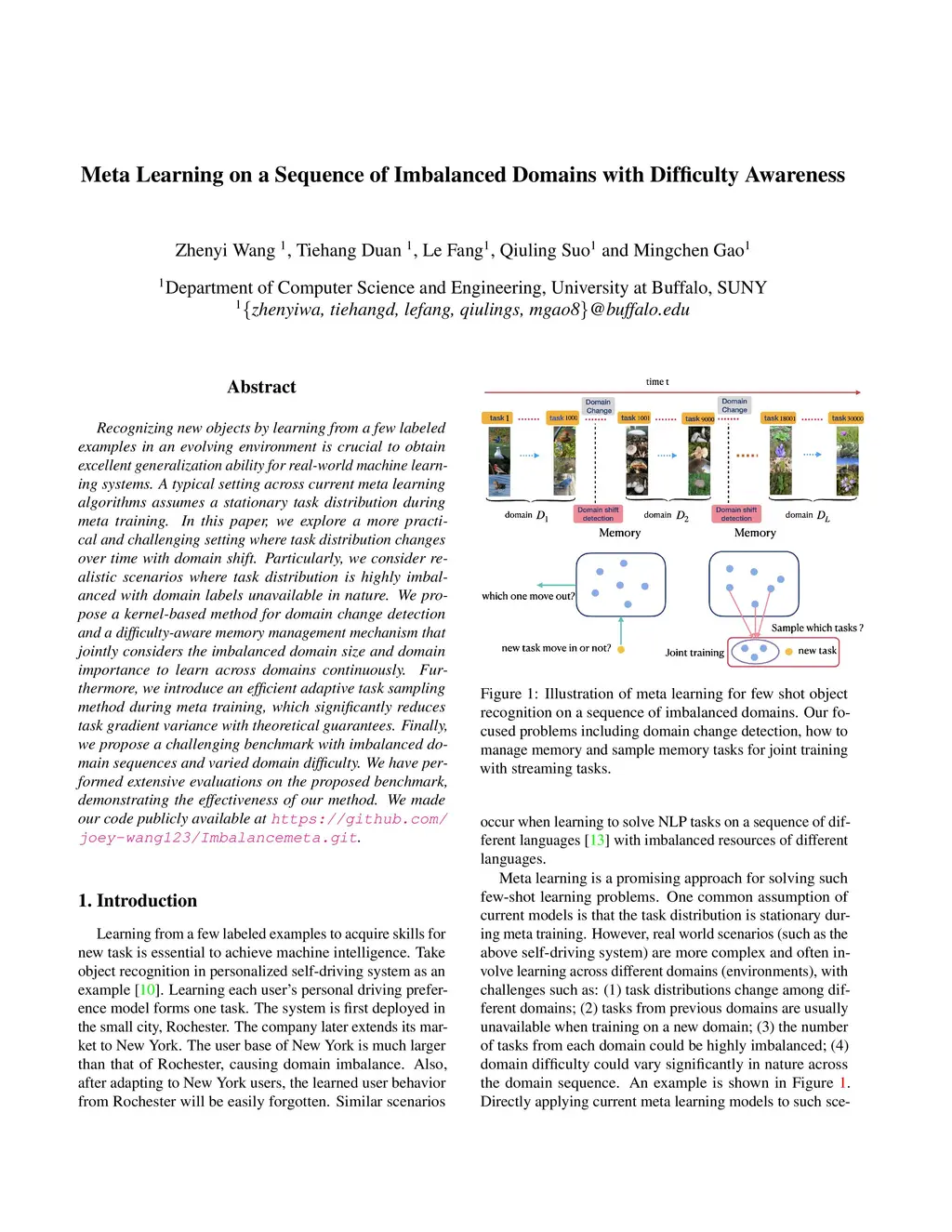 Recognizing new objects by learning from a few labeled examples in an evolving environment is crucial to obtain excellent generalization ability for real-world machine learning systems. A typical setting across current meta learning algorithms assumes a stationary task distribution during meta training. In this paper, we explore a more practical and challenging setting where task distribution changes over time with domain shift. Particularly, we consider realistic scenarios where task distribution is highly imbalanced with domain labels unavailable in nature. We propose a kernel-based method for domain change detection and a difficulty-aware memory management mechanism that jointly considers the imbalanced domain size and domain importance to learn across domains continuously. Furthermore, we introduce an efficient adaptive task sampling method during meta training, which significantly reduces task gradient variance with theoretical guarantees. Finally, we propose a challenging benchmark with imbalanced domain sequences and varied domain difficulty. We have performed extensive evaluations on the proposed benchmark, demonstrating the effectiveness of our method. We made our code publicly available.