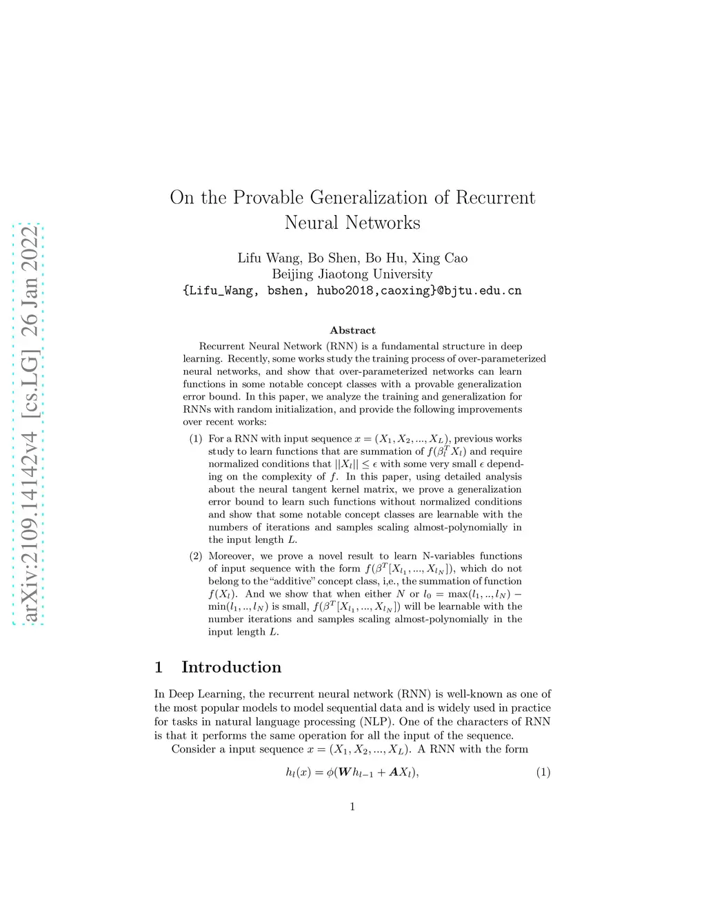 Recurrent Neural Network (RNN) is a fundamental structure in deep learning. Recently, some works study the training process of over-parameterized neural networks, and show that over-parameterized networks can learn functions in some notable concept classes with a provable generalization error bound. In this paper, we analyze the training and generalization for RNNs with random initialization, and provide the following improvements over recent works: 1) For a RNN with input sequence , previous works study to learn functions that are summation of and require normalized conditions that with some very small depending on the complexity of . In this paper, using detailed analysis about the neural tangent kernel matrix, we prove a generalization error bound to learn such functions without normalized conditions and show that some notable concept classes are learnable with the numbers of iterations and samples scaling almost-polynomially in the input length . 2) Moreover, we prove a novel result to learn N-variables functions of input sequence with the form , which do not belong to the "additive" concept class, i,e., the summation of function . And we show that when either or is small, will be learnable with the number iterations and samples scaling almost-polynomially in the input length .