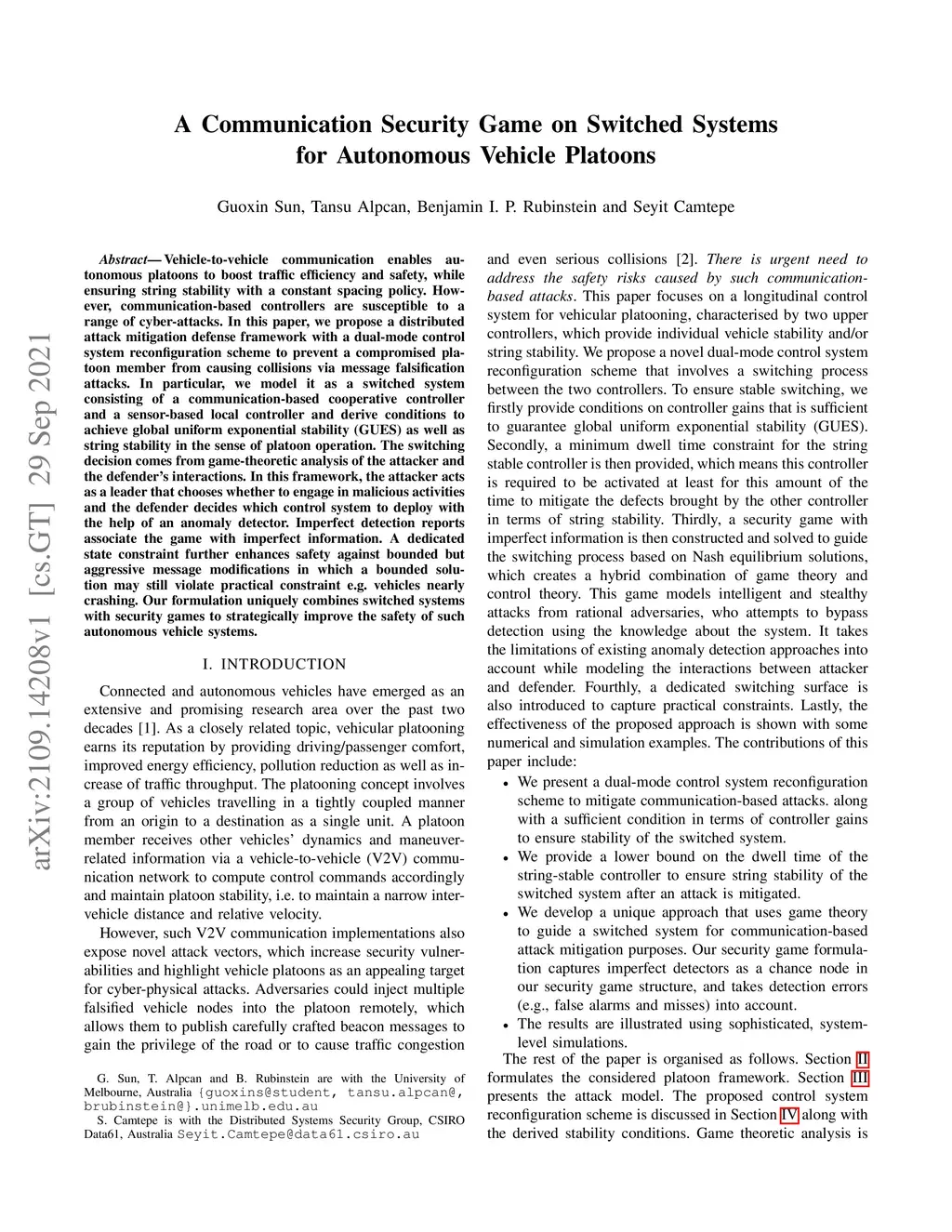 Vehicle-to-vehicle communication enables autonomous platoons to boost traffic efficiency and safety, while ensuring string stability with a constant spacing policy. However, communication-based controllers are susceptible to a range of cyber-attacks. In this paper, we propose a distributed attack mitigation defense framework with a dual-mode control system reconfiguration scheme to prevent a compromised platoon member from causing collisions via message falsification attacks. In particular, we model it as a switched system consisting of a communication-based cooperative controller and a sensor-based local controller and derive conditions to achieve global uniform exponential stability (GUES) as well as string stability in the sense of platoon operation. The switching decision comes from game-theoretic analysis of the attacker and the defender's interactions. In this framework, the attacker acts as a leader that chooses whether to engage in malicious activities and the defender decides which control system to deploy with the help of an anomaly detector. Imperfect detection reports associate the game with imperfect information. A dedicated state constraint further enhances safety against bounded but aggressive message modifications in which a bounded solution may still violate practical constraint e.g. vehicles nearly crashing. Our formulation uniquely combines switched systems with security games to strategically improve the safety of such autonomous vehicle systems.