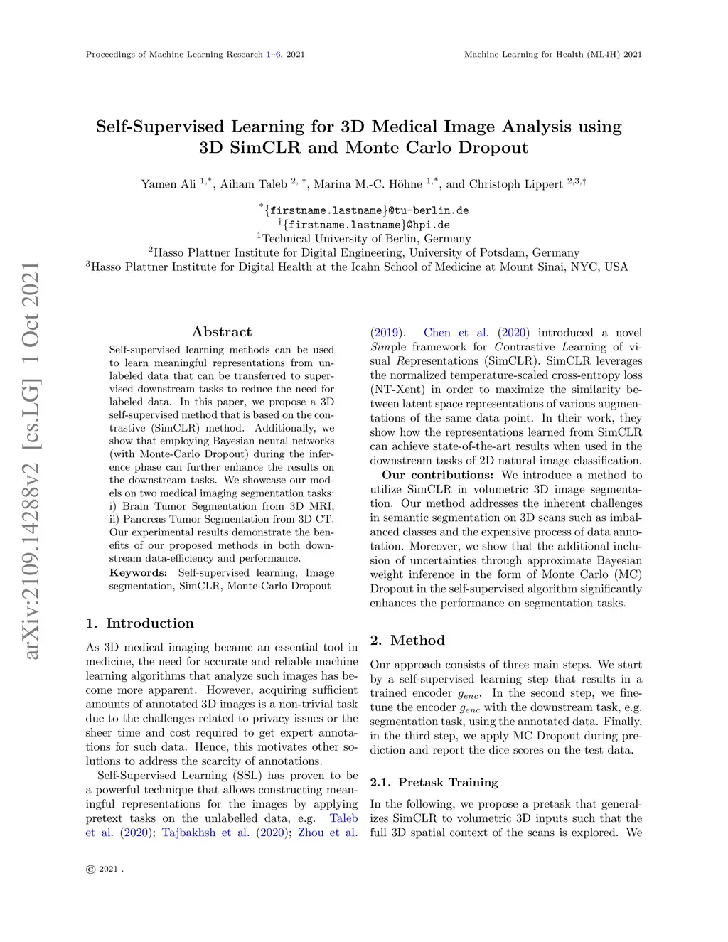 Self-supervised learning methods can be used to learn meaningful representations from unlabeled data that can be transferred to supervised downstream tasks to reduce the need for labeled data. In this paper, we propose a 3D self-supervised method that is based on the contrastive (SimCLR) method. Additionally, we show that employing Bayesian neural networks (with Monte-Carlo Dropout) during the inference phase can further enhance the results on the downstream tasks. We showcase our models on two medical imaging segmentation tasks: i) Brain Tumor Segmentation from 3D MRI, ii) Pancreas Tumor Segmentation from 3D CT. Our experimental results demonstrate the benefits of our proposed methods in both downstream data-efficiency and performance.