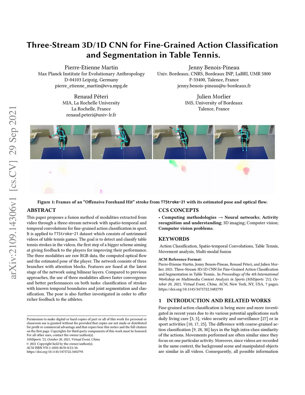 This paper proposes a fusion method of modalities extracted from video through a three-stream network with spatio-temporal and temporal convolutions for fine-grained action classification in sport. It is applied to TTStroke-21 dataset which consists of untrimmed videos of table tennis games. The goal is to detect and classify table tennis strokes in the videos, the first step of a bigger scheme aiming at giving feedback to the players for improving their performance. The three modalities are raw RGB data, the computed optical flow and the estimated pose of the player. The network consists of three branches with attention blocks. Features are fused at the latest stage of the network using bilinear layers. Compared to previous approaches, the use of three modalities allows faster convergence and better performances on both tasks: classification of strokes with known temporal boundaries and joint segmentation and classification. The pose is also further investigated in order to offer richer feedback to the athletes.