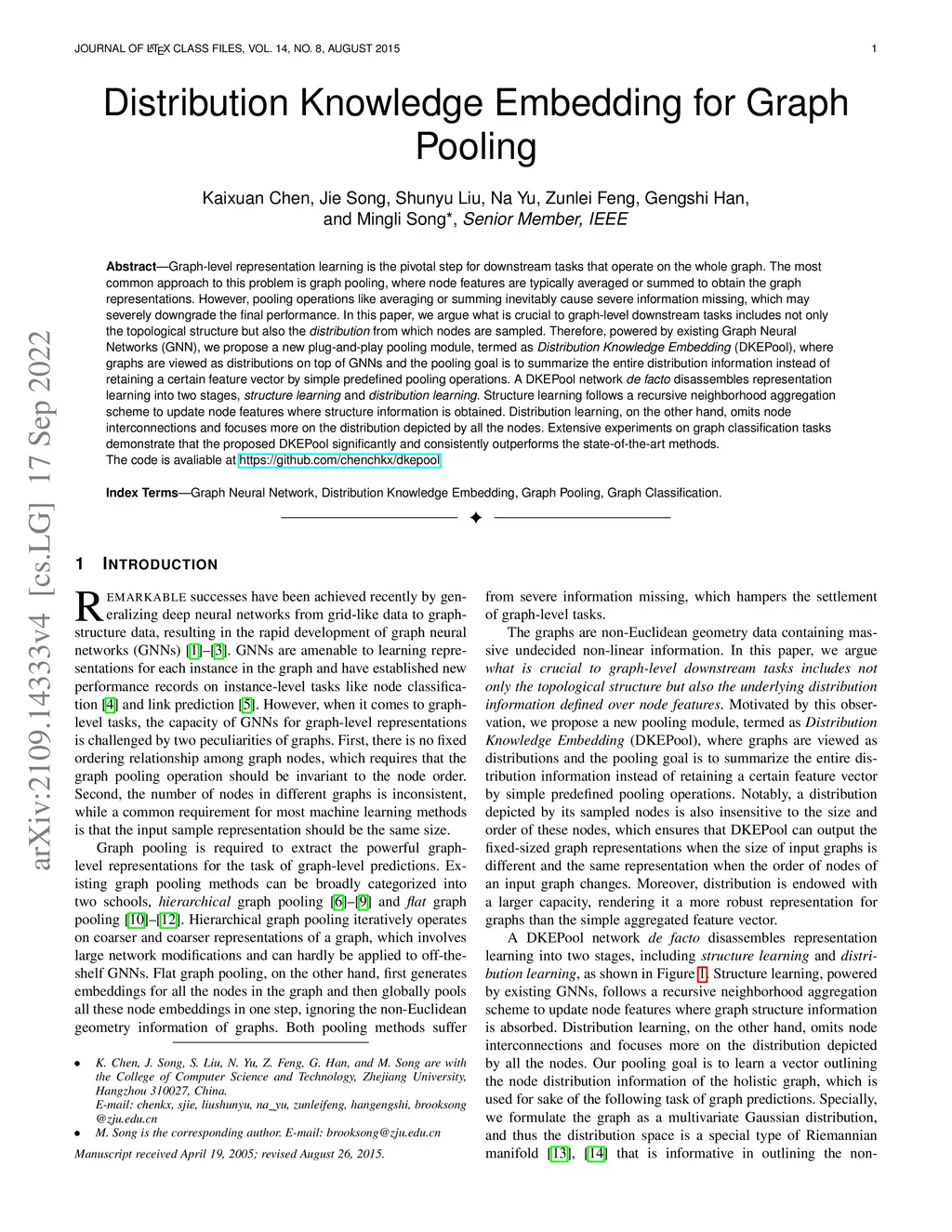 Graph-level representation learning is the pivotal step for downstream tasks that operate on the whole graph. The most common approach to this problem heretofore is graph pooling, where node features are typically averaged or summed to obtain the graph representations. However, pooling operations like averaging or summing inevitably cause massive information missing, which may severely downgrade the final performance. In this paper, we argue what is crucial to graph-level downstream tasks includes not only the topological structure but also the distribution from which nodes are sampled. Therefore, powered by existing Graph Neural Networks (GNN), we propose a new plug-and-play pooling module, termed as Distribution Knowledge Embedding (DKEPool), where graphs are rephrased as distributions on top of GNNs and the pooling goal is to summarize the entire distribution information instead of retaining a certain feature vector by simple predefined pooling operations. A DKEPool network de facto disassembles representation learning into two stages, structure learning and distribution learning. Structure learning follows a recursive neighborhood aggregation scheme to update node features where structure information is obtained. Distribution learning, on the other hand, omits node interconnections and focuses more on the distribution depicted by all the nodes. Extensive experiments demonstrate that the proposed DKEPool significantly and consistently outperforms the state-of-the-art methods.