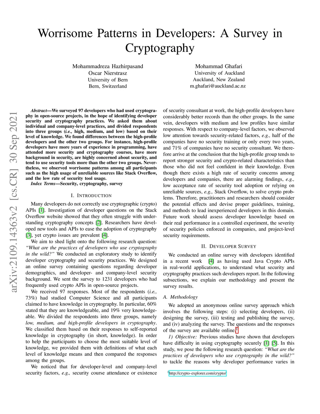 We surveyed 97 developers who had used cryptography in open-source projects, in the hope of identifying developer security and cryptography practices. We asked them about individual and company-level practices, and divided respondents into three groups (i.e., high, medium, and low) based on their level of knowledge. We found differences between the high-profile developers and the other two groups. For instance, high-profile developers have more years of experience in programming, have attended more security and cryptography courses, have more background in security, are highly concerned about security, and tend to use security tools more than the other two groups. Nevertheless, we observed worrisome patterns among all participants such as the high usage of unreliable sources like Stack Overflow, and the low rate of security tool usage.