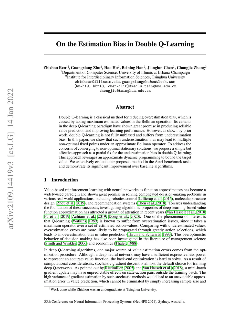 Double Q-learning is a classical method for reducing overestimation bias, which is caused by taking maximum estimated values in the Bellman operation. Its variants in the deep Q-learning paradigm have shown great promise in producing reliable value prediction and improving learning performance. However, as shown by prior work, double Q-learning is not fully unbiased and suffers from underestimation bias. In this paper, we show that such underestimation bias may lead to multiple non-optimal fixed points under an approximate Bellman operator. To address the concerns of converging to non-optimal stationary solutions, we propose a simple but effective approach as a partial fix for the underestimation bias in double Q-learning. This approach leverages an approximate dynamic programming to bound the target value. We extensively evaluate our proposed method in the Atari benchmark tasks and demonstrate its significant improvement over baseline algorithms.
