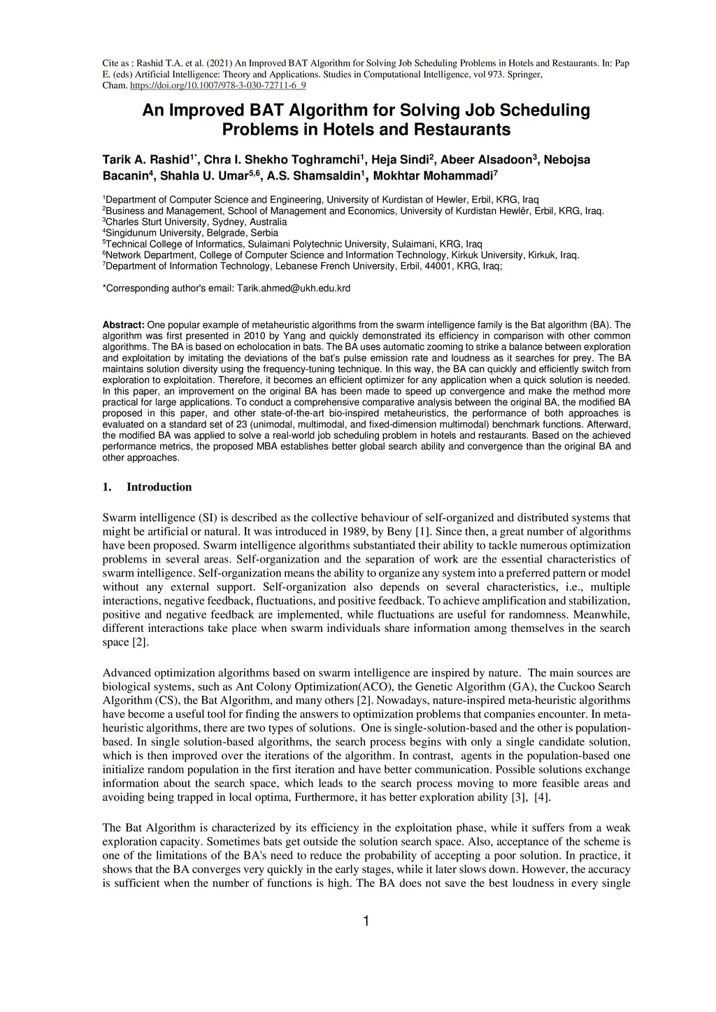 One popular example of metaheuristic algorithms from the swarm intelligence family is the Bat algorithm (BA). The algorithm was first presented in 2010 by Yang and quickly demonstrated its efficiency in comparison with other common algorithms. The BA is based on echolocation in bats. The BA uses automatic zooming to strike a balance between exploration and exploitation by imitating the deviations of the bat's pulse emission rate and loudness as it searches for prey. The BA maintains solution diversity using the frequency-tuning technique. In this way, the BA can quickly and efficiently switch from exploration to exploitation. Therefore, it becomes an efficient optimizer for any application when a quick solution is needed. In this paper, an improvement on the original BA has been made to speed up convergence and make the method more practical for large applications. To conduct a comprehensive comparative analysis between the original BA, the modified BA proposed in this paper, and other state-of-the-art bio-inspired metaheuristics, the performance of both approaches is evaluated on a standard set of 23 (unimodal, multimodal, and fixed-dimension multimodal) benchmark functions. Afterward, the modified BA was applied to solve a real-world job scheduling problem in hotels and restaurants. Based on the achieved performance metrics, the proposed MBA establishes better global search ability and convergence than the original BA and other approaches.