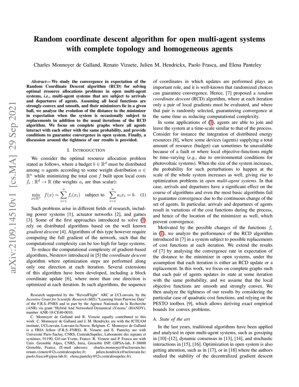 Random coordinate descent algorithm for open multi-agent systems with