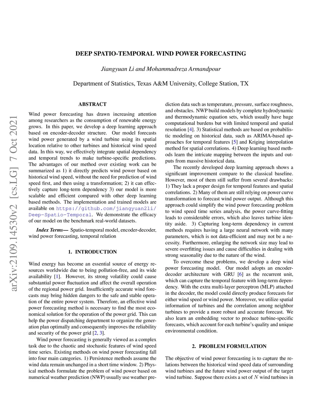 Wind power forecasting has drawn increasing attention among researchers as the consumption of renewable energy grows. In this paper, we develop a deep learning approach based on encoder-decoder structure. Our model forecasts wind power generated by a wind turbine using its spatial location relative to other turbines and historical wind speed data. In this way, we effectively integrate spatial dependency and temporal trends to make turbine-specific predictions. The advantages of our method over existing work can be summarized as 1) it directly predicts wind power based on historical wind speed, without the need for prediction of wind speed first, and then using a transformation; 2) it can effectively capture long-term dependency 3) our model is more scalable and efficient compared with other deep learning based methods. We demonstrate the efficacy of our model on the benchmark real-world datasets.