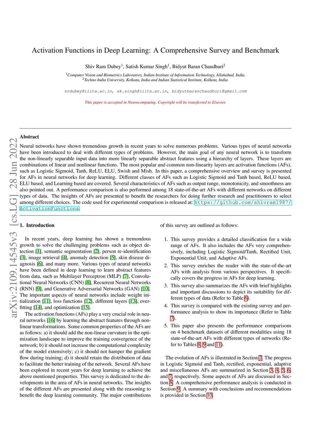 Neural networks have shown tremendous growth in recent years to solve numerous problems. Various types of neural networks have been introduced to deal with different types of problems. However, the main goal of any neural network is to transform the non-linearly separable input data into more linearly separable abstract features using a hierarchy of layers. These layers are combinations of linear and nonlinear functions. The most popular and common non-linearity layers are activation functions (AFs), such as Logistic Sigmoid, Tanh, ReLU, ELU, Swish and Mish. In this paper, a comprehensive overview and survey is presented for AFs in neural networks for deep learning. Different classes of AFs such as Logistic Sigmoid and Tanh based, ReLU based, ELU based, and Learning based are covered. Several characteristics of AFs such as output range, monotonicity, and smoothness are also pointed out. A performance comparison is also performed among 18 state-of-the-art AFs with different networks on different types of data. The insights of AFs are presented to benefit the researchers for doing further research and practitioners to select among different choices. The code used for experimental comparison is released at: \url{https://github.com/shivram1987/ActivationFunctions}.
