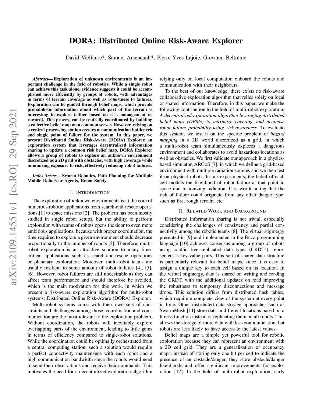 Exploration of unknown environments is an important challenge in the field of robotics. While a single robot can achieve this task alone, evidence suggests it could be accomplished more efficiently by groups of robots, with advantages in terms of terrain coverage as well as robustness to failures. Exploration can be guided through belief maps, which provide probabilistic information about which part of the terrain is interesting to explore (either based on risk management or reward). This process can be centrally coordinated by building a collective belief map on a common server. However, relying on a central processing station creates a communication bottleneck and single point of failure for the system. In this paper, we present Distributed Online Risk-Aware (DORA) Explorer, an exploration system that leverages decentralized information sharing to update a common risk belief map. DORA Explorer allows a group of robots to explore an unknown environment discretized as a 2D grid with obstacles, with high coverage while minimizing exposure to risk, effectively reducing robot failures