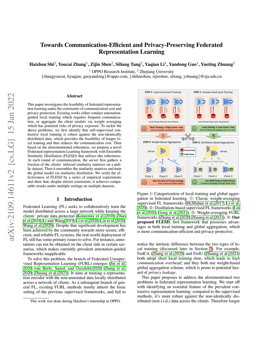 This paper investigates the feasibility of federated representation learning under the constraints of communication cost and privacy protection. Existing works either conduct annotation-guided local training which requires frequent communication or aggregates the client models via weight averaging which has potential risks of privacy exposure. To tackle the above problems, we first identify that self-supervised contrastive local training is robust against the non-identically distributed data, which provides the feasibility of longer local training and thus reduces the communication cost. Then based on the aforementioned robustness, we propose a novel Federated representation Learning framework with Ensemble Similarity Distillation~(FLESD) that utilizes this robustness. At each round of communication, the server first gathers a fraction of the clients' inferred similarity matrices on a public dataset. Then it ensembles the similarity matrices and train the global model via similarity distillation. We verify the effectiveness of FLESD by a series of empirical experiments and show that, despite stricter constraints, it achieves comparable results under multiple settings on multiple datasets.