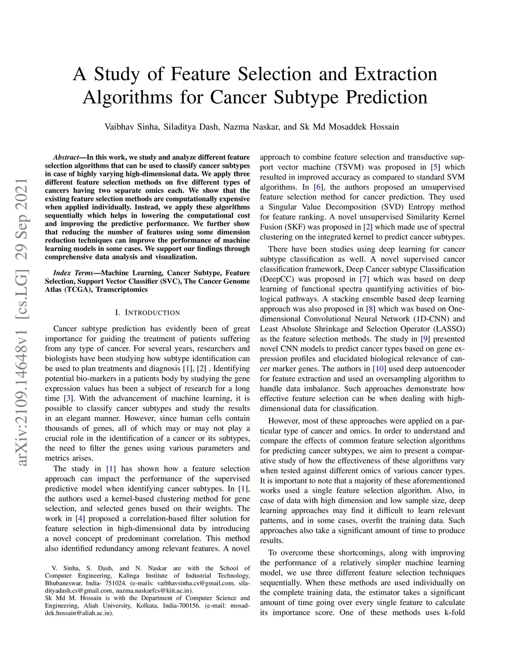 In this work, we study and analyze different feature selection algorithms that can be used to classify cancer subtypes in case of highly varying high-dimensional data. We apply three different feature selection methods on five different types of cancers having two separate omics each. We show that the existing feature selection methods are computationally expensive when applied individually. Instead, we apply these algorithms sequentially which helps in lowering the computational cost and improving the predictive performance. We further show that reducing the number of features using some dimension reduction techniques can improve the performance of machine learning models in some cases. We support our findings through comprehensive data analysis and visualization.