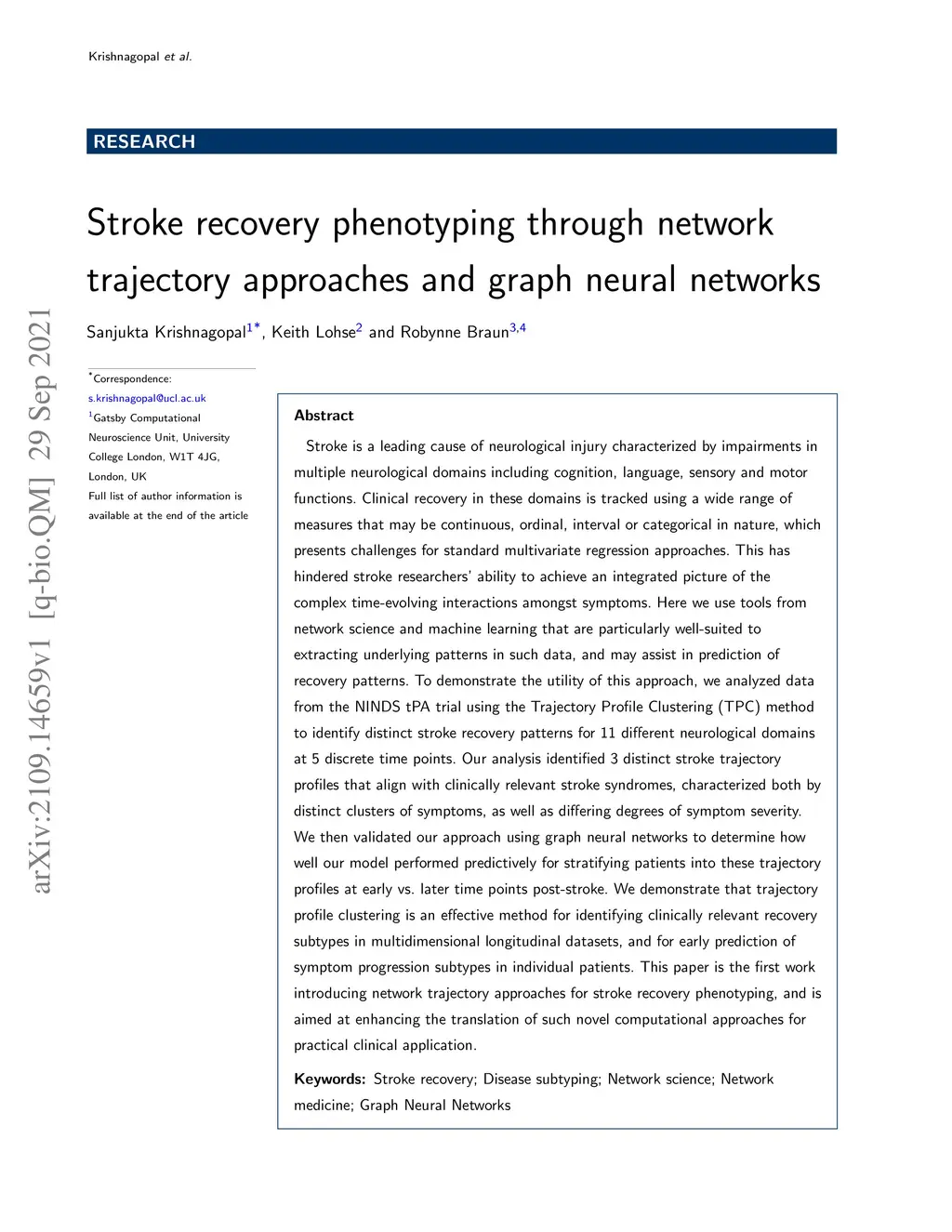 Stroke is a leading cause of neurological injury characterized by impairments in multiple neurological domains including cognition, language, sensory and motor functions. Clinical recovery in these domains is tracked using a wide range of measures that may be continuous, ordinal, interval or categorical in nature, which presents challenges for standard multivariate regression approaches. This has hindered stroke researchers' ability to achieve an integrated picture of the complex time-evolving interactions amongst symptoms. Here we use tools from network science and machine learning that are particularly well-suited to extracting underlying patterns in such data, and may assist in prediction of recovery patterns. To demonstrate the utility of this approach, we analyzed data from the NINDS tPA trial using the Trajectory Profile Clustering (TPC) method to identify distinct stroke recovery patterns for 11 different neurological domains at 5 discrete time points. Our analysis identified 3 distinct stroke trajectory profiles that align with clinically relevant stroke syndromes, characterized both by distinct clusters of symptoms, as well as differing degrees of symptom severity. We then validated our approach using graph neural networks to determine how well our model performed predictively for stratifying patients into these trajectory profiles at early vs. later time points post-stroke. We demonstrate that trajectory profile clustering is an effective method for identifying clinically relevant recovery subtypes in multidimensional longitudinal datasets, and for early prediction of symptom progression subtypes in individual patients. This paper is the first work introducing network trajectory approaches for stroke recovery phenotyping, and is aimed at enhancing the translation of such novel computational approaches for practical clinical application.