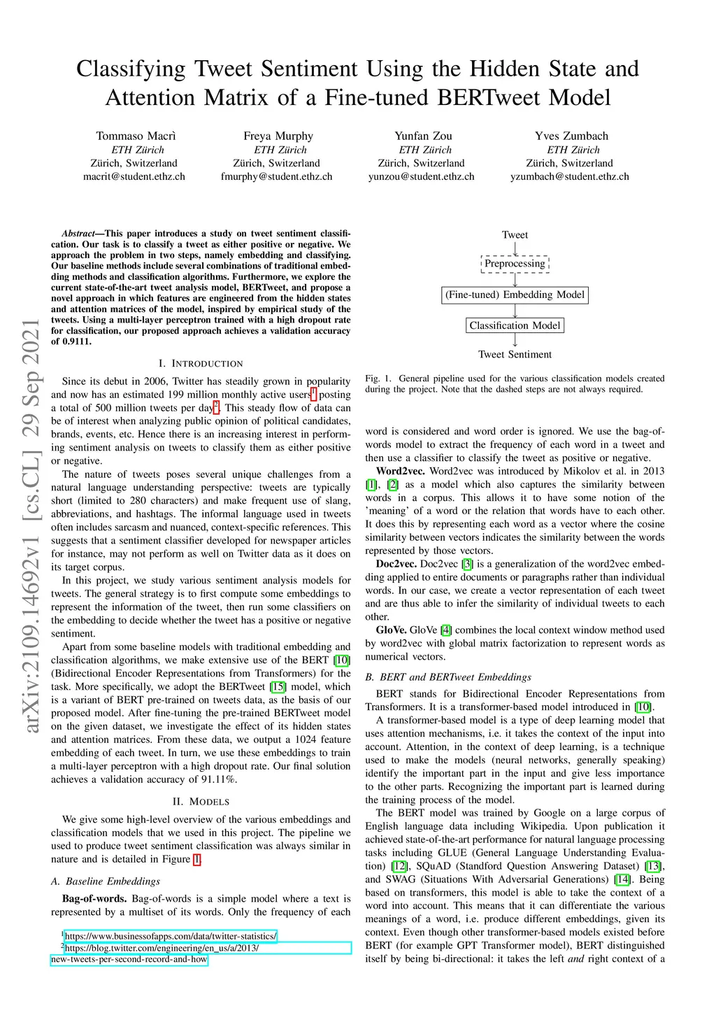 This paper introduces a study on tweet sentiment classification. Our task is to classify a tweet as either positive or negative. We approach the problem in two steps, namely embedding and classifying. Our baseline methods include several combinations of traditional embedding methods and classification algorithms. Furthermore, we explore the current state-of-the-art tweet analysis model, BERTweet, and propose a novel approach in which features are engineered from the hidden states and attention matrices of the model, inspired by empirical study of the tweets. Using a multi-layer perceptron trained with a high dropout rate for classification, our proposed approach achieves a validation accuracy of 0.9111.