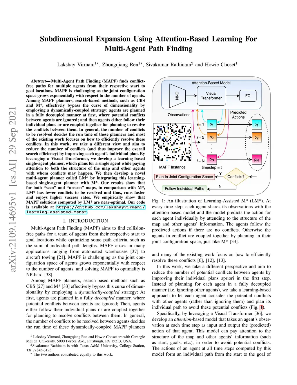 Multi-Agent Path Finding (MAPF) finds conflict-free paths for multiple agents from their respective start to goal locations. MAPF is challenging as the joint configuration space grows exponentially with respect to the number of agents. Among MAPF planners, search-based methods, such as CBS and M*, effectively bypass the curse of dimensionality by employing a dynamically-coupled strategy: agents are planned in a fully decoupled manner at first, where potential conflicts between agents are ignored; and then agents either follow their individual plans or are coupled together for planning to resolve the conflicts between them. In general, the number of conflicts to be resolved decides the run time of these planners and most of the existing work focuses on how to efficiently resolve these conflicts. In this work, we take a different view and aim to reduce the number of conflicts (and thus improve the overall search efficiency) by improving each agent's individual plan. By leveraging a Visual Transformer, we develop a learning-based single-agent planner, which plans for a single agent while paying attention to both the structure of the map and other agents with whom conflicts may happen. We then develop a novel multi-agent planner called LM* by integrating this learning-based single-agent planner with M*. Our results show that for both "seen" and "unseen" maps, in comparison with M*, LM* has fewer conflicts to be resolved and thus, runs faster and enjoys higher success rates. We empirically show that MAPF solutions computed by LM* are near-optimal. Our code is available at https://github.com/lakshayvirmani/learning-assisted-mstar .