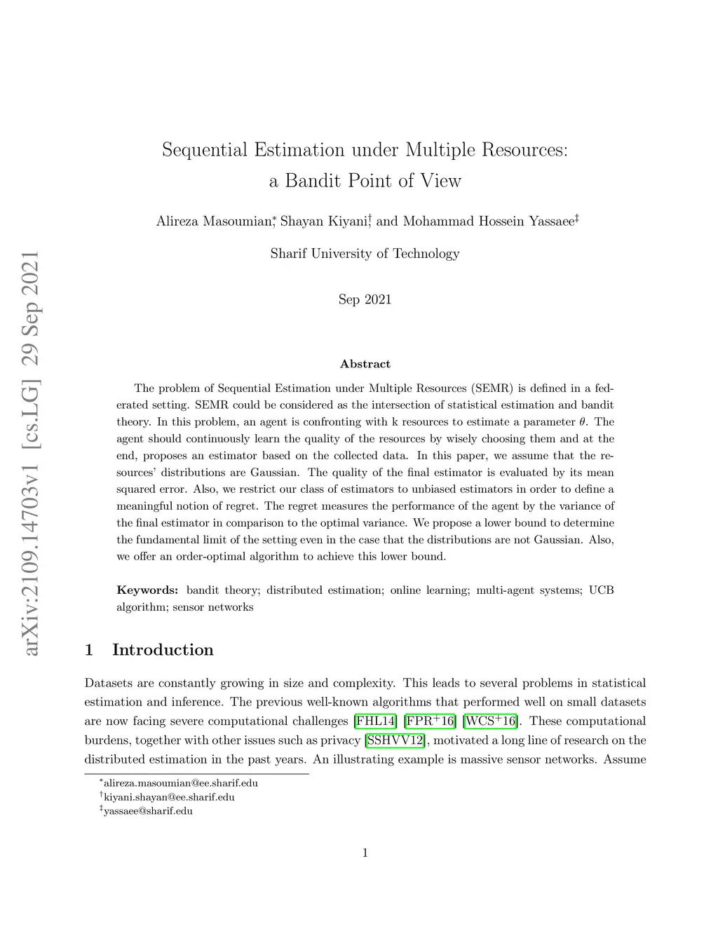 The problem of Sequential Estimation under Multiple Resources (SEMR) is defined in a federated setting. SEMR could be considered as the intersection of statistical estimation and bandit theory. In this problem, an agent is confronting with k resources to estimate a parameter . The agent should continuously learn the quality of the resources by wisely choosing them and at the end, proposes an estimator based on the collected data. In this paper, we assume that the resources' distributions are Gaussian. The quality of the final estimator is evaluated by its mean squared error. Also, we restrict our class of estimators to unbiased estimators in order to define a meaningful notion of regret. The regret measures the performance of the agent by the variance of the final estimator in comparison to the optimal variance. We propose a lower bound to determine the fundamental limit of the setting even in the case that the distributions are not Gaussian. Also, we offer an order-optimal algorithm to achieve this lower bound.