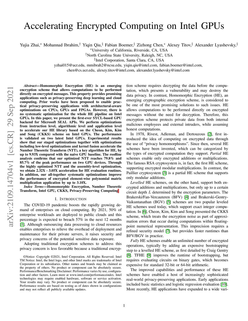 Homomorphic Encryption (HE) is an emerging encryption scheme that allows computations to be performed directly on encrypted messages. This property provides promising applications such as privacy-preserving deep learning and cloud computing. Prior works have been proposed to enable practical privacy-preserving applications with architectural-aware optimizations on CPUs, GPUs and FPGAs. However, there is no systematic optimization for the whole HE pipeline on Intel GPUs. In this paper, we present the first-ever SYCL-based GPU backend for Microsoft SEAL APIs. We perform optimizations from instruction level, algorithmic level and application level to accelerate our HE library based on the Cheon, Kim, Kimand Song (CKKS) scheme on Intel GPUs. The performance is validated on two latest Intel GPUs. Experimental results show that our staged optimizations together with optimizations including low-level optimizations and kernel fusion accelerate the Number Theoretic Transform (NTT), a key algorithm for HE, by up to 9.93X compared with the na\"ive GPU baseline. The roofline analysis confirms that our optimized NTT reaches 79.8% and85.7% of the peak performance on two GPU devices. Through the highly optimized NTT and the assembly-level optimization, we obtain 2.32X - 3.05X acceleration for HE evaluation routines. In addition, our all-together systematic optimizations improve the performance of encrypted element-wise polynomial matrix multiplication application by up to 3.10X.