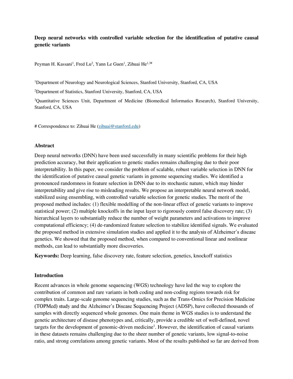 Deep neural networks (DNN) have been used successfully in many scientific problems for their high prediction accuracy, but their application to genetic studies remains challenging due to their poor interpretability. In this paper, we consider the problem of scalable, robust variable selection in DNN for the identification of putative causal genetic variants in genome sequencing studies. We identified a pronounced randomness in feature selection in DNN due to its stochastic nature, which may hinder interpretability and give rise to misleading results. We propose an interpretable neural network model, stabilized using ensembling, with controlled variable selection for genetic studies. The merit of the proposed method includes: (1) flexible modelling of the non-linear effect of genetic variants to improve statistical power; (2) multiple knockoffs in the input layer to rigorously control false discovery rate; (3) hierarchical layers to substantially reduce the number of weight parameters and activations to improve computational efficiency; (4) de-randomized feature selection to stabilize identified signals. We evaluated the proposed method in extensive simulation studies and applied it to the analysis of Alzheimer disease genetics. We showed that the proposed method, when compared to conventional linear and nonlinear methods, can lead to substantially more discoveries.