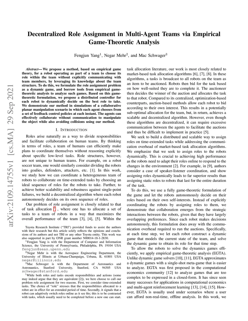 We propose a method, based on empirical game theory, for a robot operating as part of a team to choose its role within the team without explicitly communicating with team members, by leveraging its knowledge about the team structure. To do this, we formulate the role assignment problem as a dynamic game, and borrow tools from empirical game-theoretic analysis to analyze such games. Based on this game-theoretic formulation, we propose a distributed controller for each robot to dynamically decide on the best role to take. We demonstrate our method in simulations of a collaborative planar manipulation scenario in which each agent chooses from a set of feedback control policies at each instant. The agents can effectively collaborate without communication to manipulate the object while also avoiding collisions using our method.