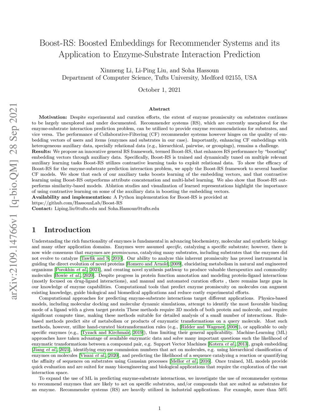 Despite experimental and curation efforts, the extent of enzyme promiscuity on substrates continues to be largely unexplored and under documented. Recommender systems (RS), which are currently unexplored for the enzyme-substrate interaction prediction problem, can be utilized to provide enzyme recommendations for substrates, and vice versa. The performance of Collaborative-Filtering (CF) recommender systems however hinges on the quality of embedding vectors of users and items (enzymes and substrates in our case). Importantly, enhancing CF embeddings with heterogeneous auxiliary data, specially relational data (e.g., hierarchical, pairwise, or groupings), remains a challenge. We propose an innovative general RS framework, termed Boost-RS, that enhances RS performance by "boosting" embedding vectors through auxiliary data. Specifically, Boost-RS is trained and dynamically tuned on multiple relevant auxiliary learning tasks Boost-RS utilizes contrastive learning tasks to exploit relational data. To show the efficacy of Boost-RS for the enzyme-substrate prediction interaction problem, we apply the Boost-RS framework to several baseline CF models. We show that each of our auxiliary tasks boosts learning of the embedding vectors, and that contrastive learning using Boost-RS outperforms attribute concatenation and multi-label learning. We also show that Boost-RS outperforms similarity-based models. Ablation studies and visualization of learned representations highlight the importance of using contrastive learning on some of the auxiliary data in boosting the embedding vectors.