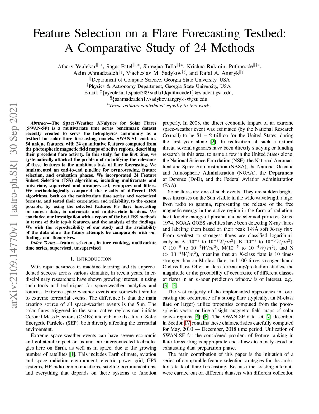 The Space-Weather ANalytics for Solar Flares (SWAN-SF) is a multivariate time series benchmark dataset recently created to serve the heliophysics community as a testbed for solar flare forecasting models. SWAN-SF contains 54 unique features, with 24 quantitative features computed from the photospheric magnetic field maps of active regions, describing their precedent flare activity. In this study, for the first time, we systematically attacked the problem of quantifying the relevance of these features to the ambitious task of flare forecasting. We implemented an end-to-end pipeline for preprocessing, feature selection, and evaluation phases. We incorporated 24 Feature Subset Selection (FSS) algorithms, including multivariate and univariate, supervised and unsupervised, wrappers and filters. We methodologically compared the results of different FSS algorithms, both on the multivariate time series and vectorized formats, and tested their correlation and reliability, to the extent possible, by using the selected features for flare forecasting on unseen data, in univariate and multivariate fashions. We concluded our investigation with a report of the best FSS methods in terms of their top-k features, and the analysis of the findings. We wish the reproducibility of our study and the availability of the data allow the future attempts be comparable with our findings and themselves.