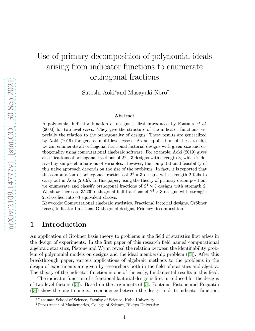 A polynomial indicator function of designs is first introduced by Fontana {\it et al}. (2000) for two-level cases. They give the structure of the indicator functions, especially the relation to the orthogonality of designs. These results are generalized by Aoki (2019) for general multi-level cases. As an application of these results, we can enumerate all orthogonal fractional factorial designs with given size and orthogonality using computational algebraic software. For example, Aoki (2019) gives classifications of orthogonal fractions of 2x2x2x2x3 designs with strength 3, which is derived by simple eliminations of variables. However, the computational feasibility of this naive approach depends on the size of the problems. In fact, it is reported that the computation of orthogonal fractions of 2x2x2x2x3 designs with strength 2 fails to carry out in Aoki (2019). In this paper, using the theory of primary decomposition, we enumerate and classify orthogonal fractions of 2x2x2x2x3 designs with strength 2. We show there are 35200 orthogonal half fractions of 2x2x2x2x3 designs with strength 2, classified into 63 equivalent classes.