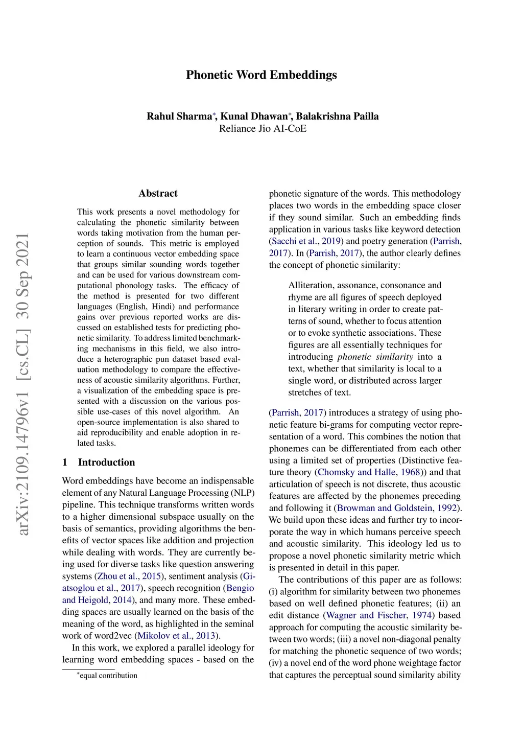 This work presents a novel methodology for calculating the phonetic similarity between words taking motivation from the human perception of sounds. This metric is employed to learn a continuous vector embedding space that groups similar sounding words together and can be used for various downstream computational phonology tasks. The efficacy of the method is presented for two different languages (English, Hindi) and performance gains over previous reported works are discussed on established tests for predicting phonetic similarity. To address limited benchmarking mechanisms in this field, we also introduce a heterographic pun dataset based evaluation methodology to compare the effectiveness of acoustic similarity algorithms. Further, a visualization of the embedding space is presented with a discussion on the various possible use-cases of this novel algorithm. An open-source implementation is also shared to aid reproducibility and enable adoption in related tasks.
