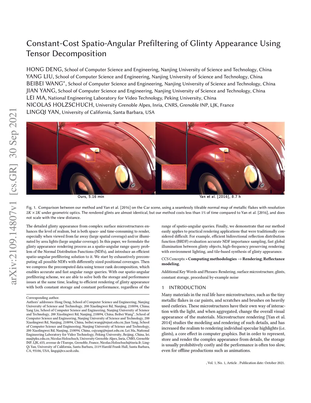 The detailed glinty appearance from complex surface microstructures enhances the level of realism, but is both space- and time-consuming to render, especially when viewed from far away (large spatial coverage) and/or illuminated by area lights (large angular coverage). In this paper, we formulate the glinty appearance rendering process as a spatio-angular range query problem of the Normal Distribution Functions (NDFs), and introduce an efficient spatio-angular prefiltering solution to it. We start by exhaustively precomputing all possible NDFs with differently sized positional coverages. Then we compress the precomputed data using tensor rank decomposition, which enables accurate and fast angular range queries. With our spatio-angular prefiltering scheme, we are able to solve both the storage and performance issues at the same time, leading to efficient rendering of glinty appearance with both constant storage and constant performance, regardless of the range of spatio-angular queries. Finally, we demonstrate that our method easily applies to practical rendering applications that were traditionally considered difficult. For example, efficient bidirectional reflection distribution function (BRDF) evaluation accurate NDF importance sampling, fast global illumination between glinty objects, high-frequency preserving rendering with environment lighting, and tile-based synthesis of glinty appearance.