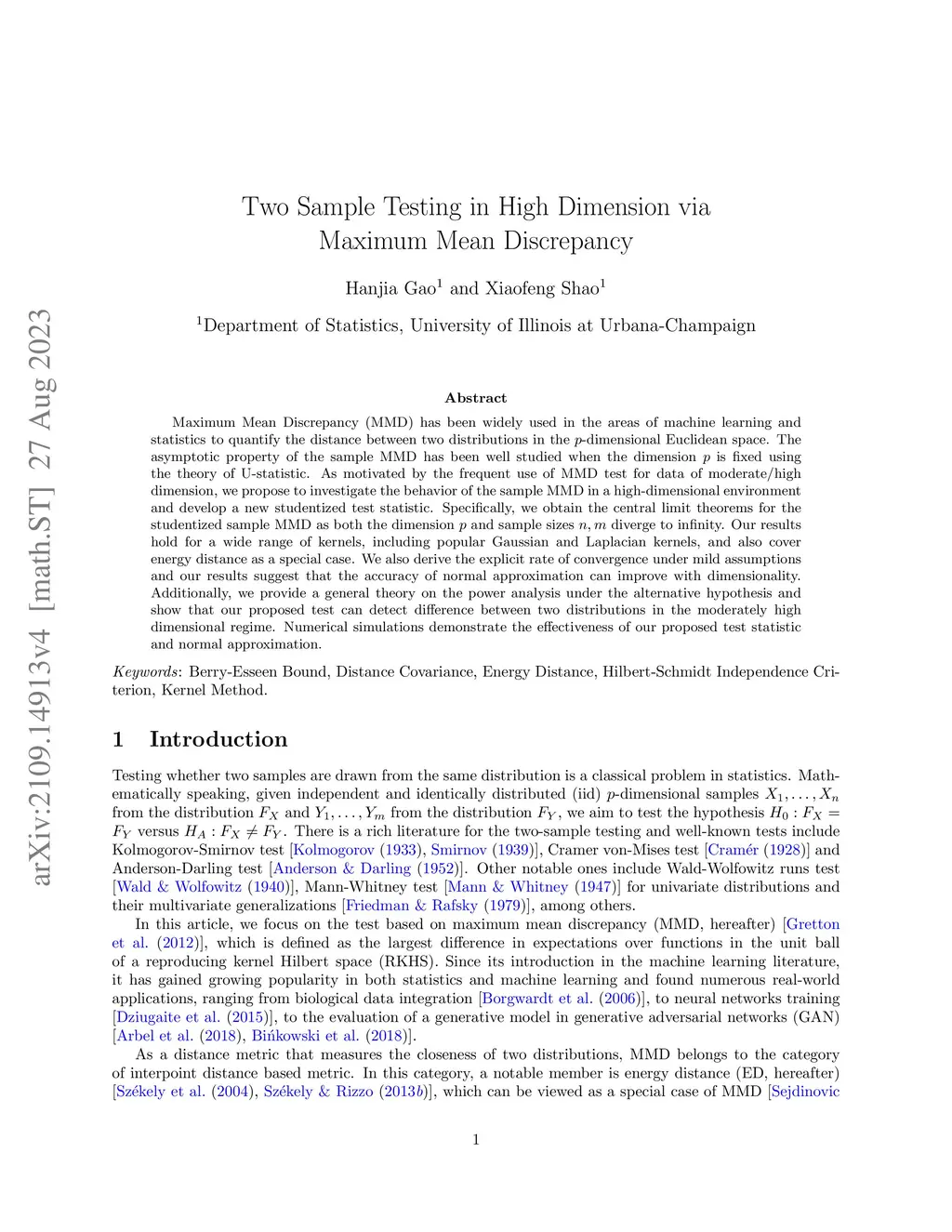 Two Sample Testing in High Dimension via Maximum Mean Discrepancy