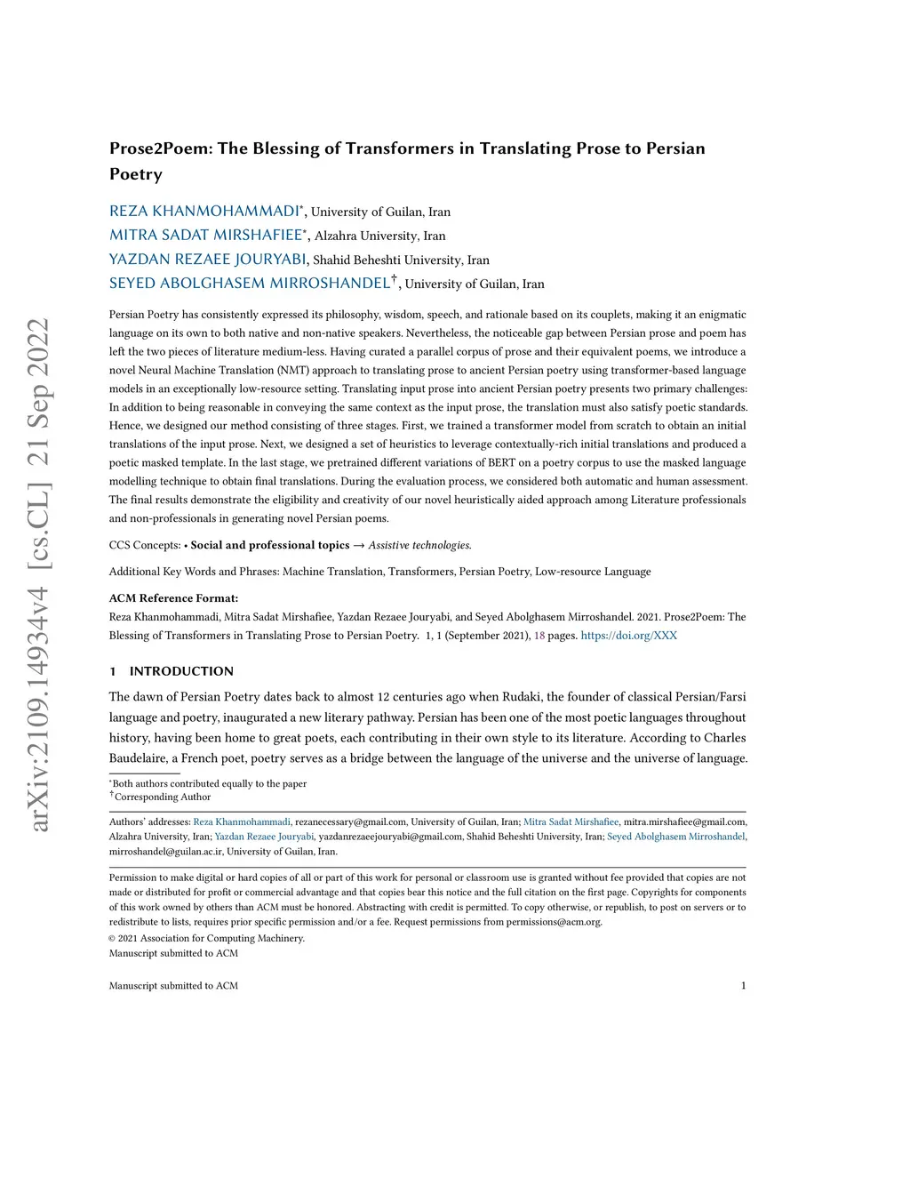 Prose2Poem: The Blessing of Transformers in Translating Prose to Persian