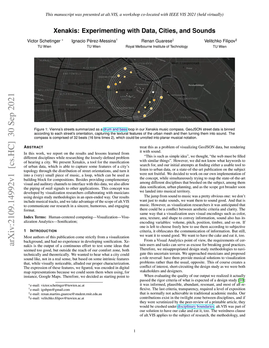 In this work, we report on the results and lessons learned from different disciplines while researching the loosely-defined problem of hearing a city. We present Xenakis, a tool for the musification of urban data, which is able to capture some features of a city's topology through the distribution of street orientations, and turn it into a (very) small piece of music, a loop, which can be used as building block for compositions. Besides providing complementary visual and auditory channels to interface with this data, we also allow the piping of \textit{midi} signals to other applications. This concept was developed by visualization researchers collaborating with musicians using design study methodologies in an open-ended way. Our results include musical tracks, and we take advantage of the scope of alt.VIS to communicate our research in a sincere, humorous, and engaging format.