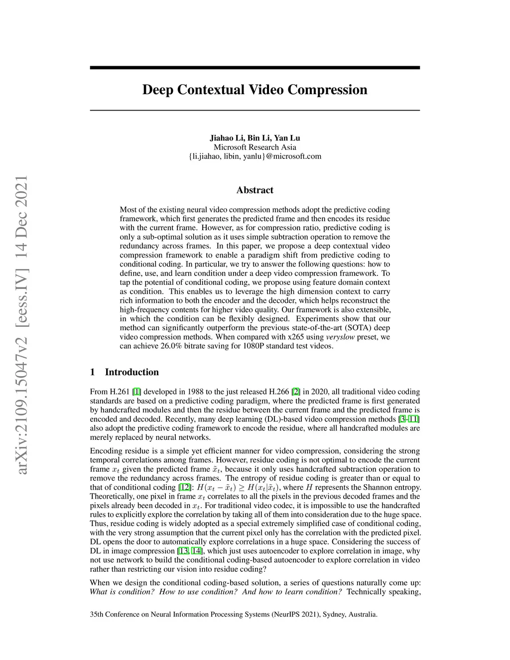 Most of the existing neural video compression methods adopt the predictive coding framework, which first generates the predicted frame and then encodes its residue with the current frame. However, as for compression ratio, predictive coding is only a sub-optimal solution as it uses simple subtraction operation to remove the redundancy across frames. In this paper, we propose a deep contextual video compression framework to enable a paradigm shift from predictive coding to conditional coding. In particular, we try to answer the following questions: how to define, use, and learn condition under a deep video compression framework. To tap the potential of conditional coding, we propose using feature domain context as condition. This enables us to leverage the high dimension context to carry rich information to both the encoder and the decoder, which helps reconstruct the high-frequency contents for higher video quality. Our framework is also extensible, in which the condition can be flexibly designed. Experiments show that our method can significantly outperform the previous state-of-the-art (SOTA) deep video compression methods. When compared with x265 using veryslow preset, we can achieve 26.0% bitrate saving for 1080P standard test videos.