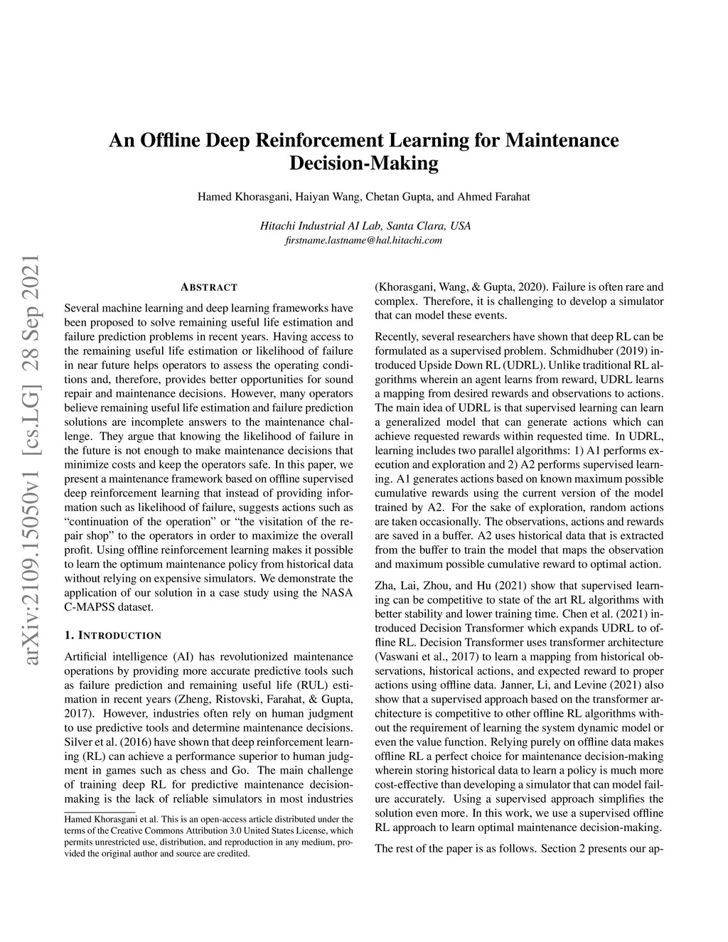 Several machine learning and deep learning frameworks have been proposed to solve remaining useful life estimation and failure prediction problems in recent years. Having access to the remaining useful life estimation or likelihood of failure in near future helps operators to assess the operating conditions and, therefore, provides better opportunities for sound repair and maintenance decisions. However, many operators believe remaining useful life estimation and failure prediction solutions are incomplete answers to the maintenance challenge. They argue that knowing the likelihood of failure in the future is not enough to make maintenance decisions that minimize costs and keep the operators safe. In this paper, we present a maintenance framework based on offline supervised deep reinforcement learning that instead of providing information such as likelihood of failure, suggests actions such as "continuation of the operation" or "the visitation of the repair shop" to the operators in order to maximize the overall profit. Using offline reinforcement learning makes it possible to learn the optimum maintenance policy from historical data without relying on expensive simulators. We demonstrate the application of our solution in a case study using the NASA C-MAPSS dataset.