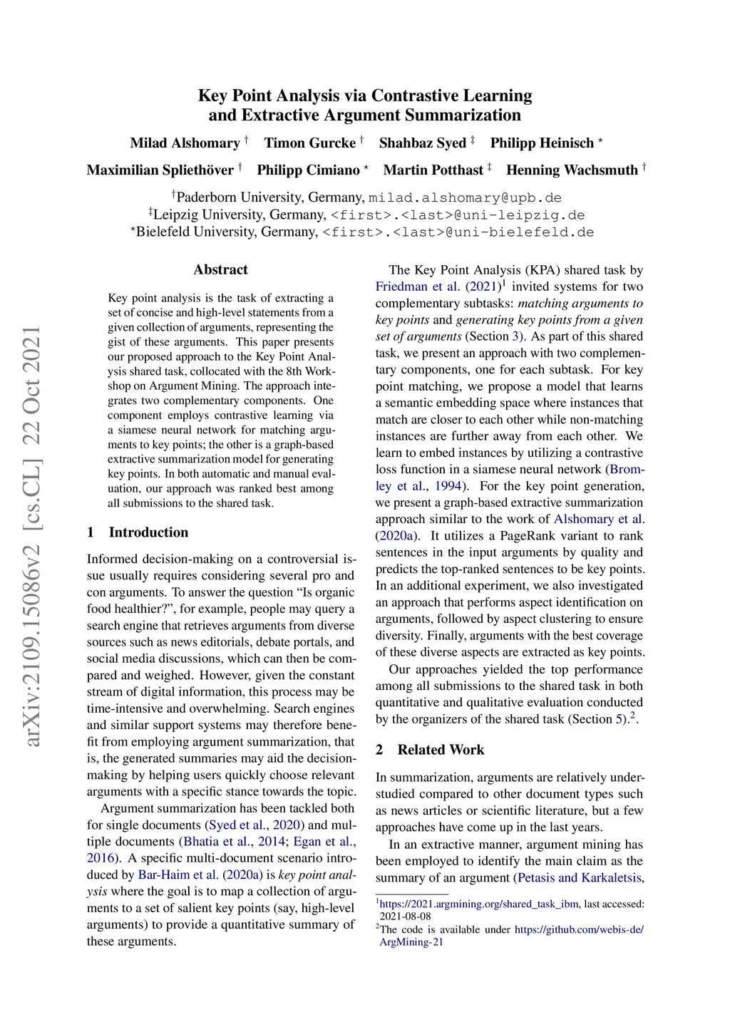 Key point analysis is the task of extracting a set of concise and high-level statements from a given collection of arguments, representing the gist of these arguments. This paper presents our proposed approach to the Key Point Analysis shared task, collocated with the 8th Workshop on Argument Mining. The approach integrates two complementary components. One component employs contrastive learning via a siamese neural network for matching arguments to key points; the other is a graph-based extractive summarization model for generating key points. In both automatic and manual evaluation, our approach was ranked best among all submissions to the shared task.
