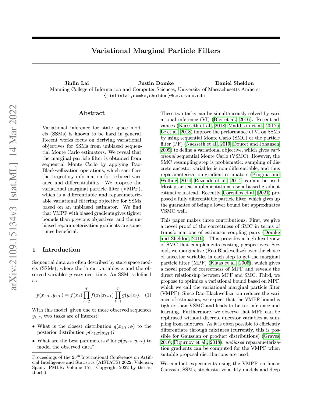 Variational inference for state space models (SSMs) is known to be hard in general. Recent works focus on deriving variational objectives for SSMs from unbiased sequential Monte Carlo estimators. We reveal that the marginal particle filter is obtained from sequential Monte Carlo by applying Rao-Blackwellization operations, which sacrifices the trajectory information for reduced variance and differentiability. We propose the variational marginal particle filter (VMPF), which is a differentiable and reparameterizable variational filtering objective for SSMs based on an unbiased estimator. We find that VMPF with biased gradients gives tighter bounds than previous objectives, and the unbiased reparameterization gradients are sometimes beneficial.