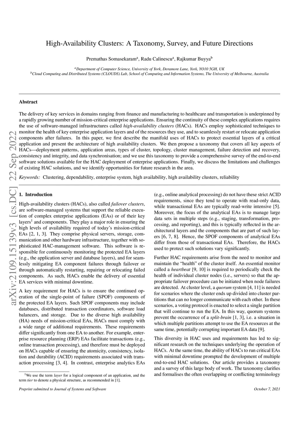 High-Availability Clusters: A Taxonomy, Survey, and Future Directions