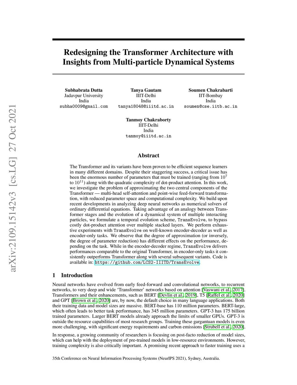 The Transformer and its variants have been proven to be efficient sequence learners in many different domains. Despite their staggering success, a critical issue has been the enormous number of parameters that must be trained (ranging from to ) along with the quadratic complexity of dot-product attention. In this work, we investigate the problem of approximating the two central components of the Transformer -- multi-head self-attention and point-wise feed-forward transformation, with reduced parameter space and computational complexity. We build upon recent developments in analyzing deep neural networks as numerical solvers of ordinary differential equations. Taking advantage of an analogy between Transformer stages and the evolution of a dynamical system of multiple interacting particles, we formulate a temporal evolution scheme, TransEvolve, to bypass costly dot-product attention over multiple stacked layers. We perform exhaustive experiments with TransEvolve on well-known encoder-decoder as well as encoder-only tasks. We observe that the degree of approximation (or inversely, the degree of parameter reduction) has different effects on the performance, depending on the task. While in the encoder-decoder regime, TransEvolve delivers performances comparable to the original Transformer, in encoder-only tasks it consistently outperforms Transformer along with several subsequent variants.